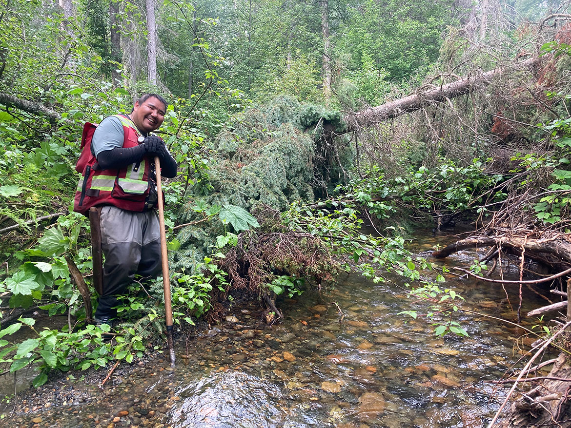 A member of Tl’azt’en Nation shares his knowledge and experience with our stock assessment team to count Early Stuart Sockeye (Talo) returning to spawn in 40 different streams north of Fort St. James. This photo was taken at Van Decar Creek, a tributary of Middle River (Dzilt’ainli Koh), located between the Takla and Trembleur Lakes.