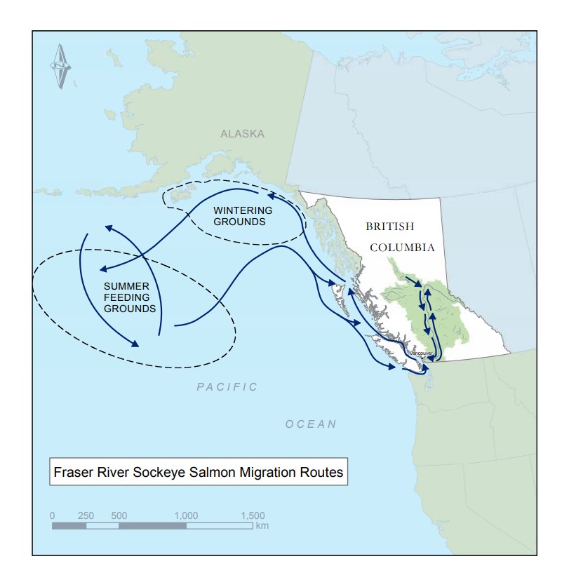 The Early Stuart Sockeye (Talo) salmon undertake the longest migration of all Fraser River sockeye, traveling nearly 1,200 kilometres from the mouth of the Fraser River to their spawning grounds in the central interior of British Columbia. Talo typically spend three years in the Pacific Ocean, and their diet consists of plankton and larva at the juvenile stage, and smaller fish, including sardines and herring at the adult stage.