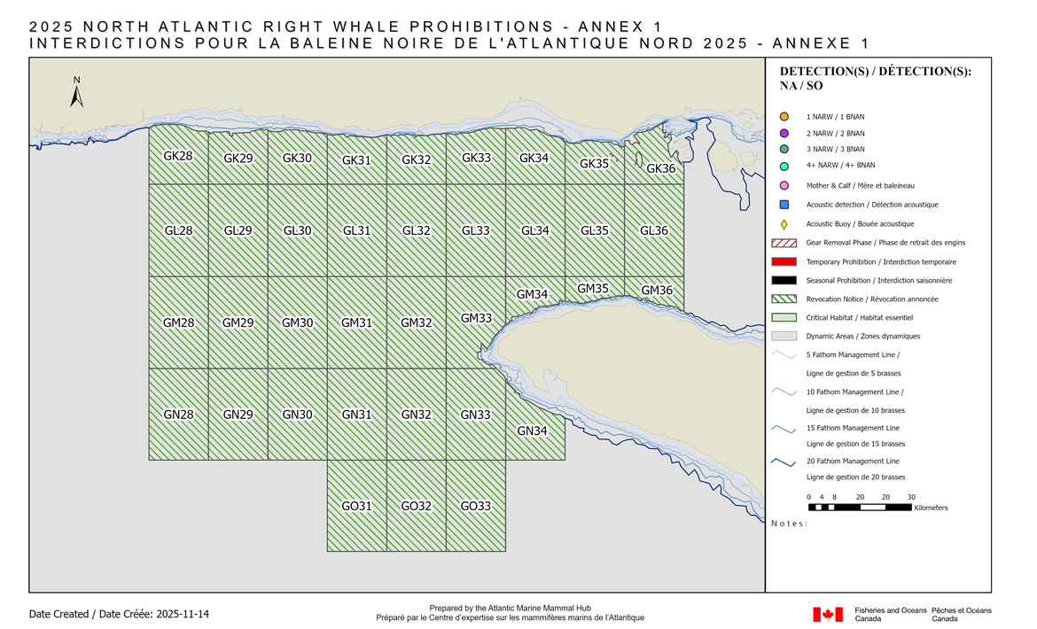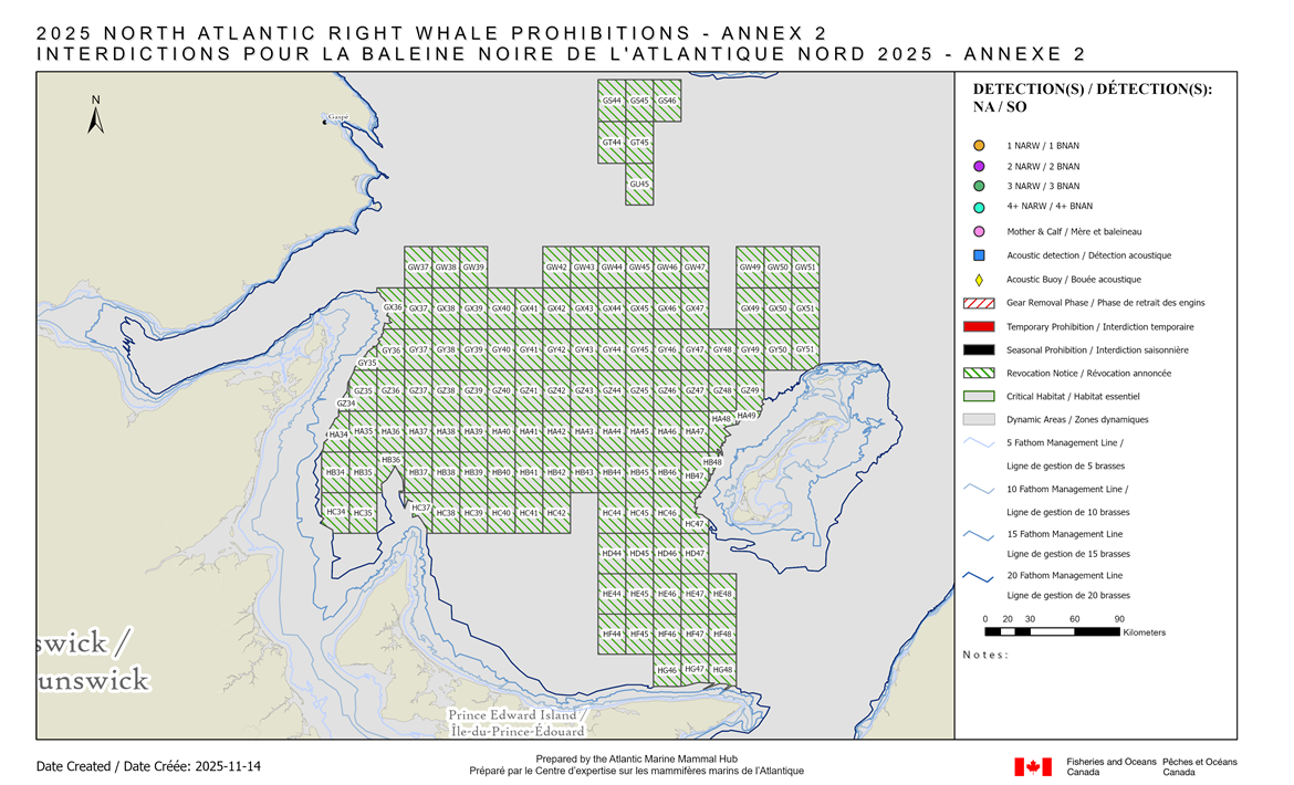 Le 14 novembre 2025 – Pêches et Océans Canada (MPO) donne un avis de mise-à-jour du statut des quadrilatères relié à la baleine noire de l’Atlantique Nord (BNAN). Les renseignements présentés sont conformes aux mesures de gestion précédemment annoncées par le MPO pour la protection de la BNAN en 2025.