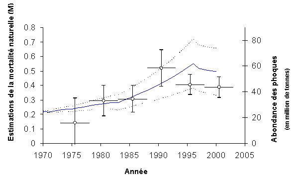 - Mortalité naturelle pour certaines périodes (cercles, lignes horizontales s'étendant sur la période visée) évaluée à partir d'analyses de populations de la morue du Sud du golfe du Saint-Laurent (Gadus morhua) et de tendances visant les populations de phoque gris (Halichoerus grypus) (traits solides), avec intervalles de confiance (ligne tiretée). Les barres d'erreur des estimations de M et les intervalles de confiance des estimations de la population de phoques gris se fondent sur une erreur-type de ± 2. Adapté de Chouinard et coll. (2005)Footnote 5