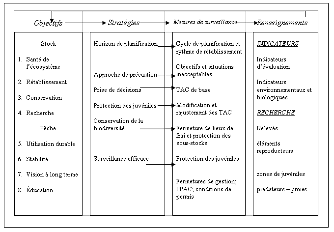 - Les gestionnaires de la ressource ne devraient pas augmenter les TAC avant de disposer de preuves claires et généralement acceptées que l'on est en train d'atteindre les buts prédéterminés en matière de rétablissement. Il est préférable de prendre plus de temps pour protéger le stock d'un autre déclin.