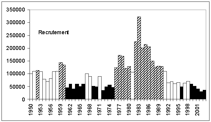La biomasse du stock reproducteur (BSR) a connu une forte baisse entre 1979 et 1990, soit de 69 000 tonnes à 19 000 tonnes. Les cohortes supérieures à la moyenne de 1993 et de 1994 ont fait grimper la BSR à 40 000 tonnes en 1998, et les bonnes cohortes de 1998 et de 1999 l'ont fait passer à 67 000 tonnes en 2003. La cohorte de 1998 est la plus forte de toute l'histoire.
