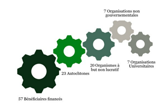 Au total, 57 bénéficiaires ont reçu du financement. Certaines organisations ont mené plus d'un projet. Les bénéficiaires du financement comprenaient un éventail d'organisations, notamment des organisations autochtones, des organismes sans but lucratif, des organisations non gouvernementales (ONG) et des établissements universitaires, comme le montre la Figure 2. Des 57 bénéficiaires du financement, les organisations autochtones étaient les plus nombreuses.