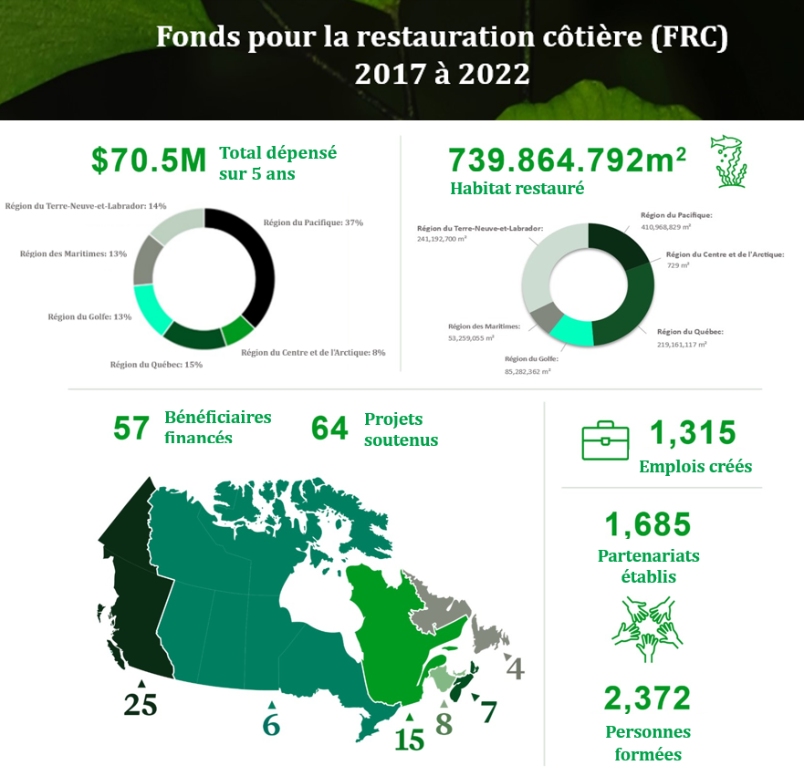 Pêches et Océans Canada (MPO) a lancé en mai 2017 le Fonds pour la restauration côtière (FRC), qui a fourni un total de 75 millions de dollars sur cinq ans pour appuyer des projets qui ont contribué à restaurer les habitats aquatiques côtiers. Le programme du FRC s'inscrit dans le cadre des mesures de mobilisation mises de l'avant dans le Plan de protection des océans (PPO) pour assurer la préservation et la restauration des écosystèmes marins. Le FRC a été créé pour faciliter les collaborations qui permettent d'élaborer et de mettre en œuvre des plans de restauration côtière, de déterminer les priorités en matière de restauration, de réaliser des projets de restauration et d'atténuer les menaces qui pèsent sur les espèces marines vivant sur les côtes du Canada.