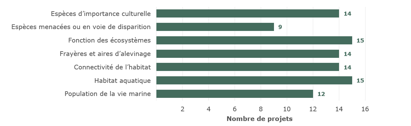 Parmi les bénéficiaires du FRC qui ont été questionnés, 95 % d'entre eux ont déclaré que leurs projets avaient atteint les objectifs de leurs ententes de contribution avec le MPO. De plus, 68 % des bénéficiaires du FRC questionnés ont indiqué que leurs projets se poursuivaient après la fin du financement du FRC. Les facteurs qui ont contribué à la durabilité des résultats du projet sont notamment le renforcement des capacités organisationnelles, la surveillance et la gestion adaptative, les fonctions d'autosuffisance des écosystèmes, la sensibilisation de la collectivité et l'acceptabilité sociale ainsi que la durabilité des partenariats.