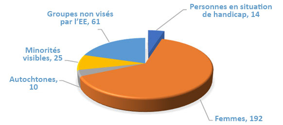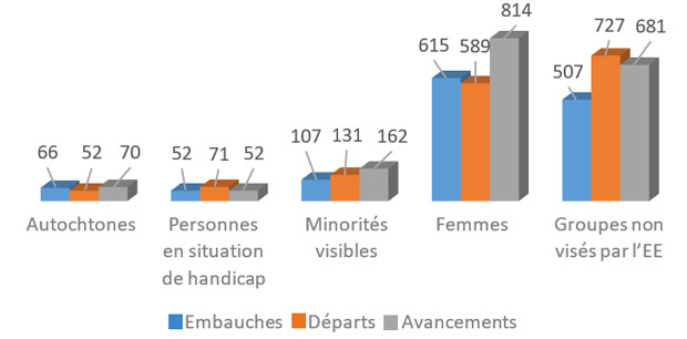 - Le nombre d'embauches pour combler les écarts est plus élevé, car il tient compte des embauches et des cessations d'emploi au sein du groupe au cours des trois dernières années.