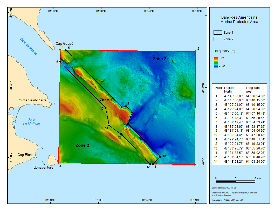 The Banc-des- Américains MPA is located off the eastern tip of the Gaspé Penisula in the St. Lawrence Estuary and Gulf bioregion. Covering an area of 1,000 km2, the MPA includes the entire underwater rocky ridge known as Banc des Américains (zone 1), as well as the adjacent plains (zones 2a and 2b).
