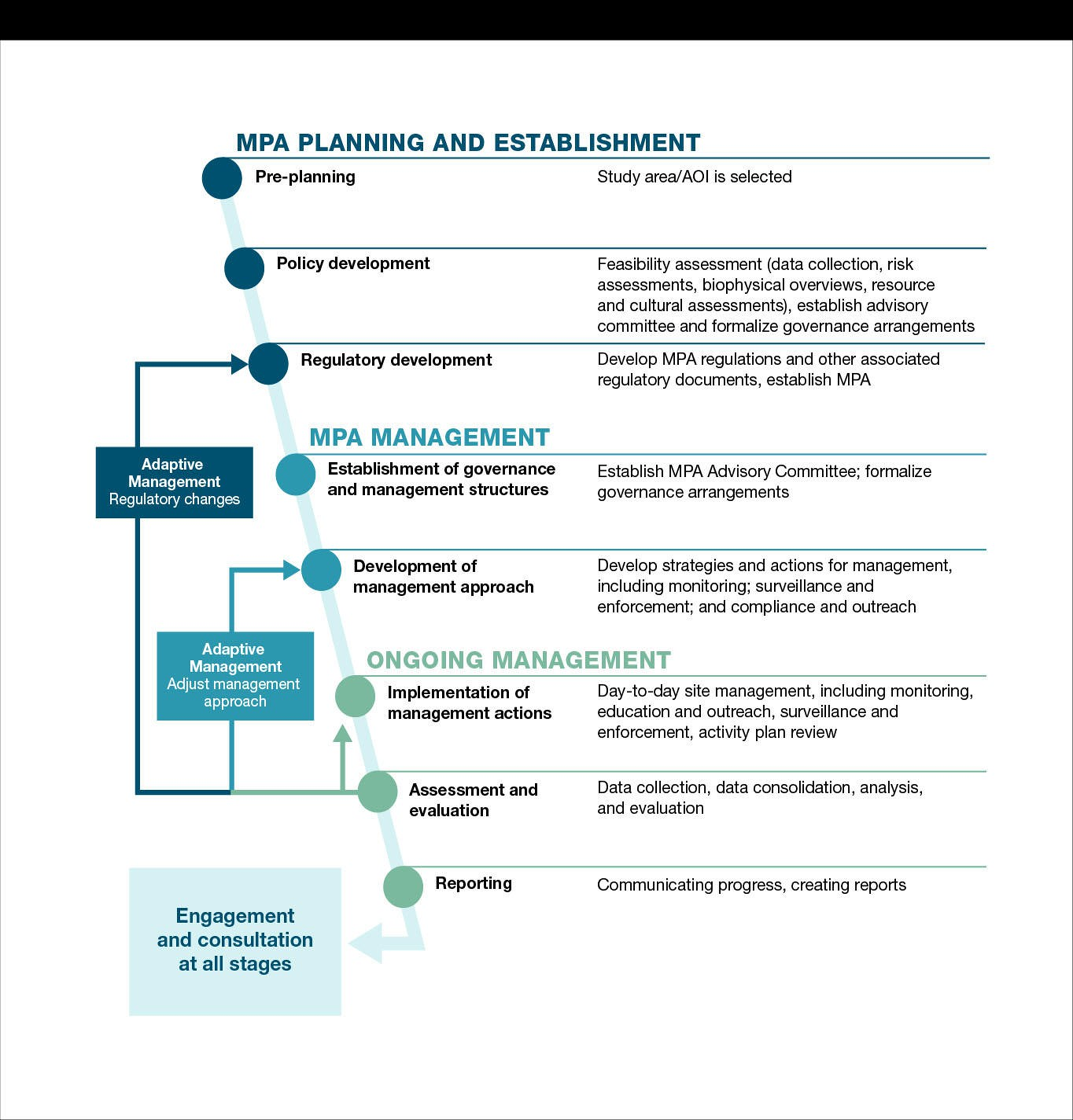 Oceans Act MPA regulations follow a life cycle approach, which means that the focus is not only on developing the regulations, but also on implementing, monitoring, assessing and reviewing them. This life cycle will be harmonized as much as possible with the regulatory processes of the Government of Quebec in order to avoid duplication.