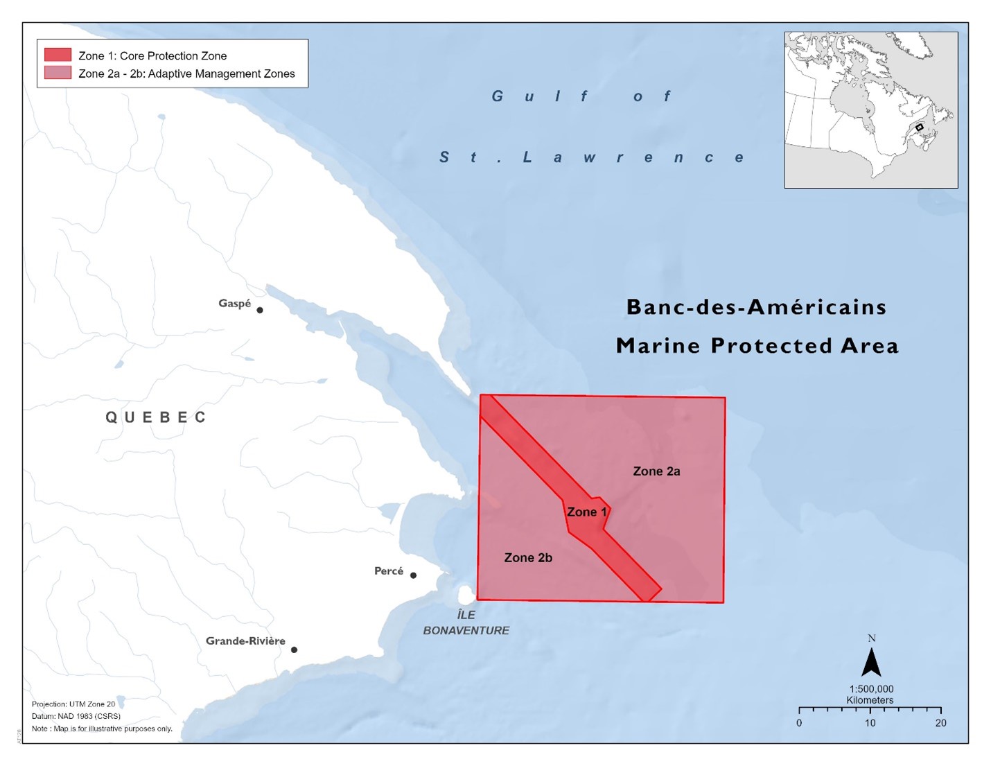 This area is currently named the Banc-des-Américains Marine Protected Area (BdA MPA). The common name refers to the MPA that is co-managed with the Government of Quebec, where federal Oceans Act MPA and Quebec MPA protection statuses overlap.