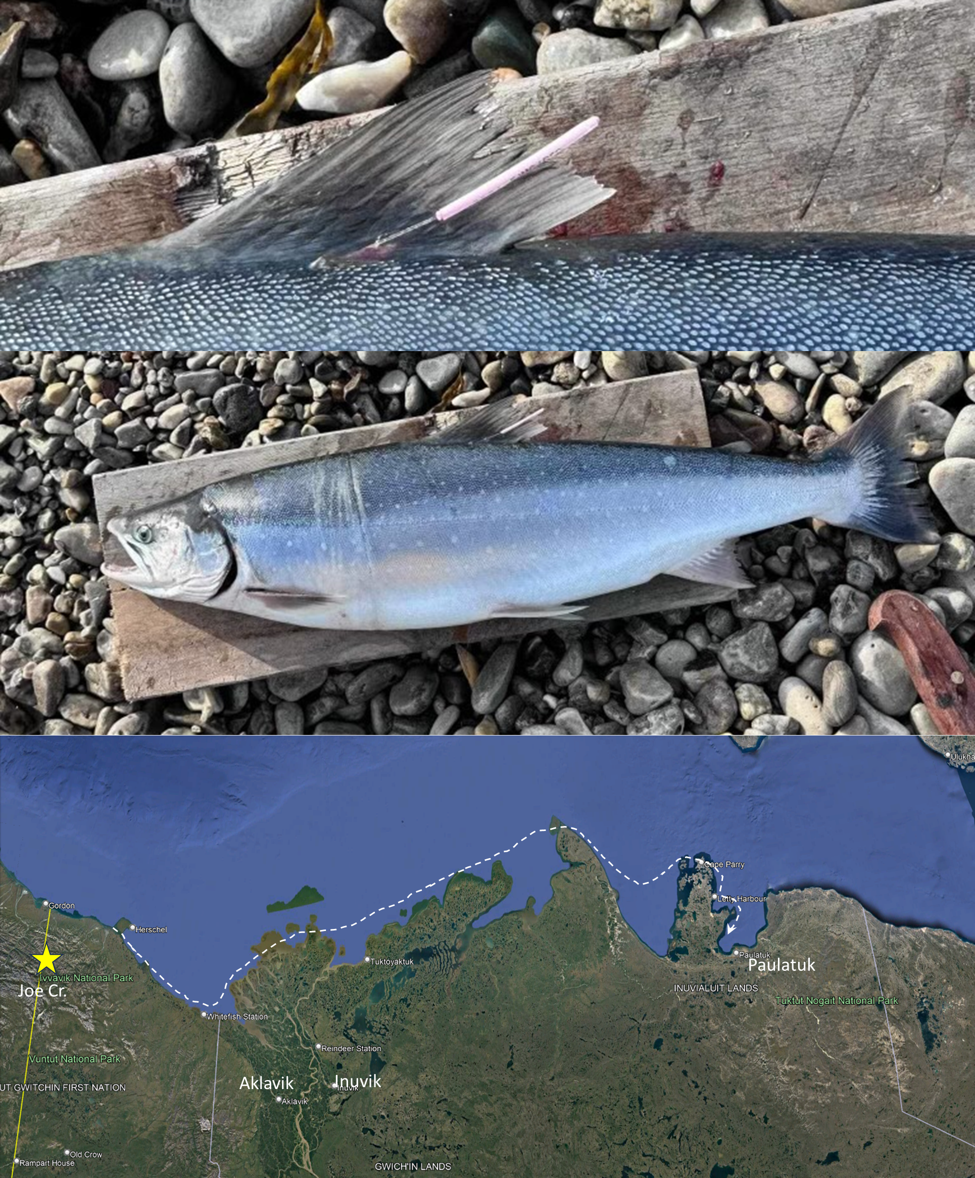 Tagged Dolly Varden in Joe Creek, Alaska, on September 23, 2023, which traveled 750 km to Darnley Bay, providing new evidence of their presence there. Photo credit: Colin Gallagher.
