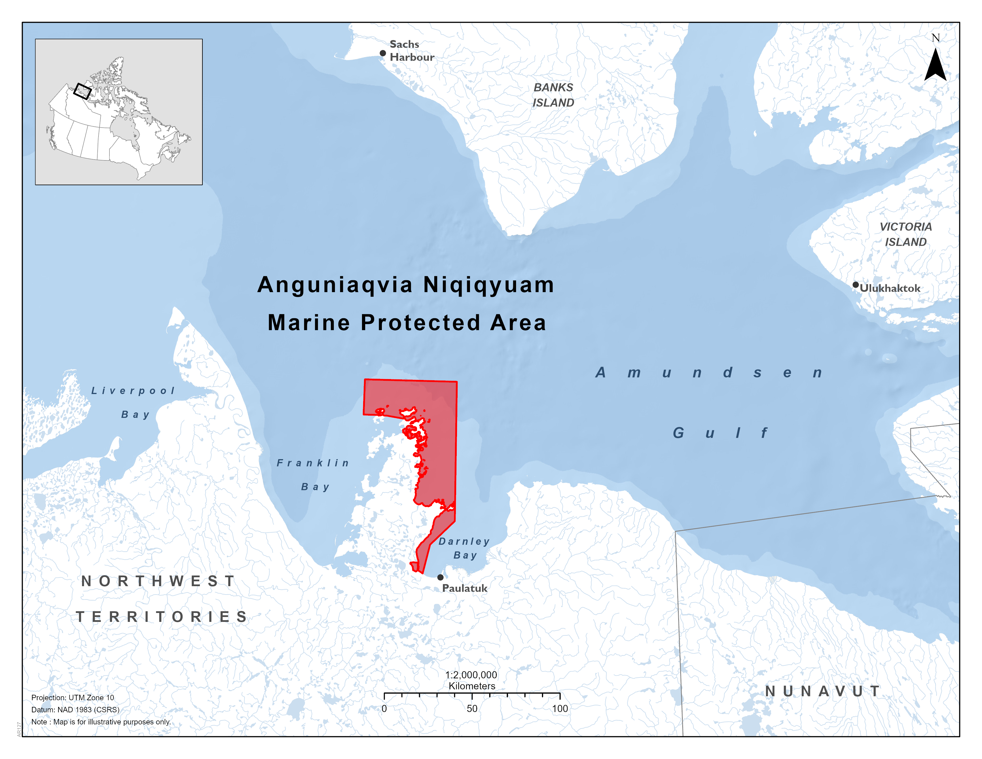 This MPA is located in Darnley Bay, near the community of Paulatuk, Northwest Territories, which is in the Inuvialuit Settlement Region (ISR). The MPA is within the Western Arctic Bioregion; Arctic Ocean.