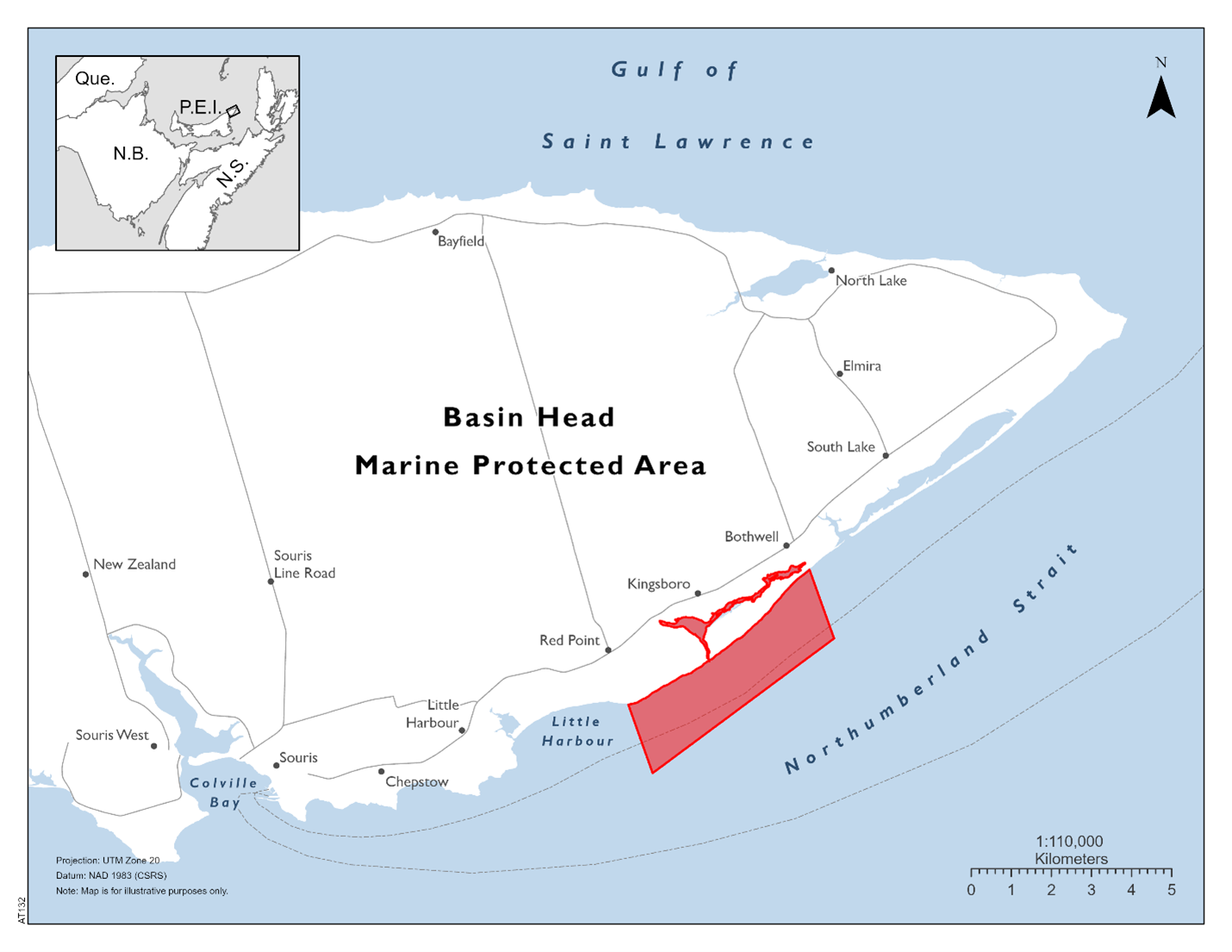 The Basin Head MPA is located between Souris and East Point, Prince Edward Island (PEI) and borders a popular provincial park. The MPA is within the Estuary and Gulf of St. Lawrence bioregion; Atlantic Ocean.
