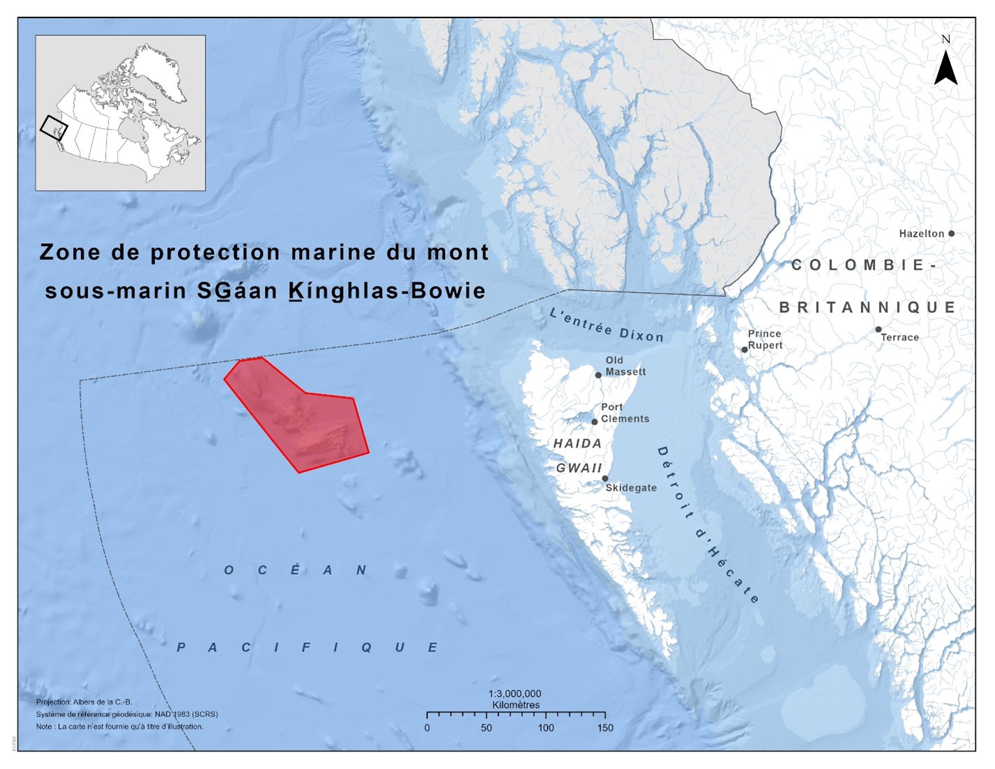Cette ZPM est située à 180 km à l’ouest de Haida Gwaii, dans la biorégion de la zone extracôtière du Pacifique, dans l’océan Pacifique.