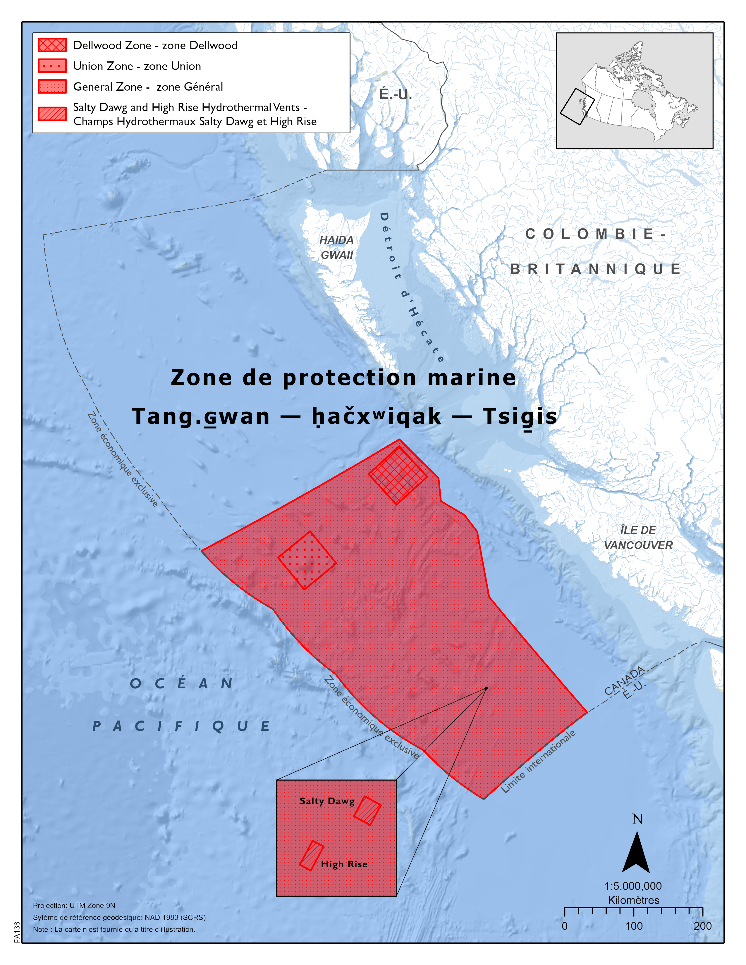 Cette ZPM est située à environ 150 km de la côte de l’île de Vancouver, en Colombie-Britannique, dans la biorégion de la zone extracôtière du Pacifique.