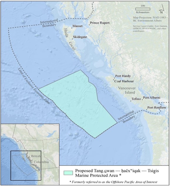 Map of the proposed Tang.ɢwan — ḥačxʷiqak — Tsig̱is Marine Protected Area, formerly referred to as the Offshore Pacific Area of Interest