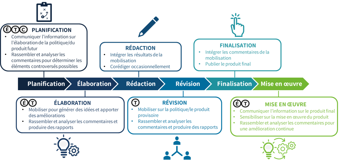 Schéma représentant les six étapes d’élaboration d’un produit et les moments où l’on peut avoir recours à la mobilisation. À l’étape de la planification, on peut avoir recours aux niveaux de mobilisation « Échanger », « Travailler ensemble » et « Confier ». Les activités de mobilisation sont les suivantes : communiquer l’information sur l’élaboration de la future politique ou du futur produit; recueillir des commentaires et les analyser pour déterminer les possibles éléments controversés. À l’étape de l’élaboration, on peut avoir recours aux niveaux de mobilisation « Échanger » ou « Travailler ensemble ». Les activités de mobilisation sont les suivantes : dialoguer pour générer des idées et apporter des améliorations; recueillir des commentaires, les analyser et produire des rapports connexes. L’étape de la rédaction consiste à intégrer les résultats de la mobilisation et, à l’occasion, à corédiger certains éléments. À l’étape de la révision, on peut avoir recours au niveau de mobilisation « Travailler ensemble ». Les activités de mobilisation sont les suivantes : tenir des consultations sur l’ébauche de la politique ou du produit; recueillir des commentaires, les analyser et produire des rapports connexes. L’étape de la finalisation consiste à tenir compte des commentaires recueillis dans le cadre et à publier le produit final. À l’étape de la mise en œuvre, on peut avoir recours aux niveaux de mobilisation « Échanger » ou « Travailler ensemble ». Les activités de mobilisation sont les suivantes : communiquer l’information sur le produit final; expliquer comment le mettre en œuvre; recueillir des commentaires et les analyser aux fins d’amélioration continue.