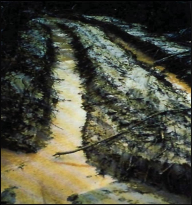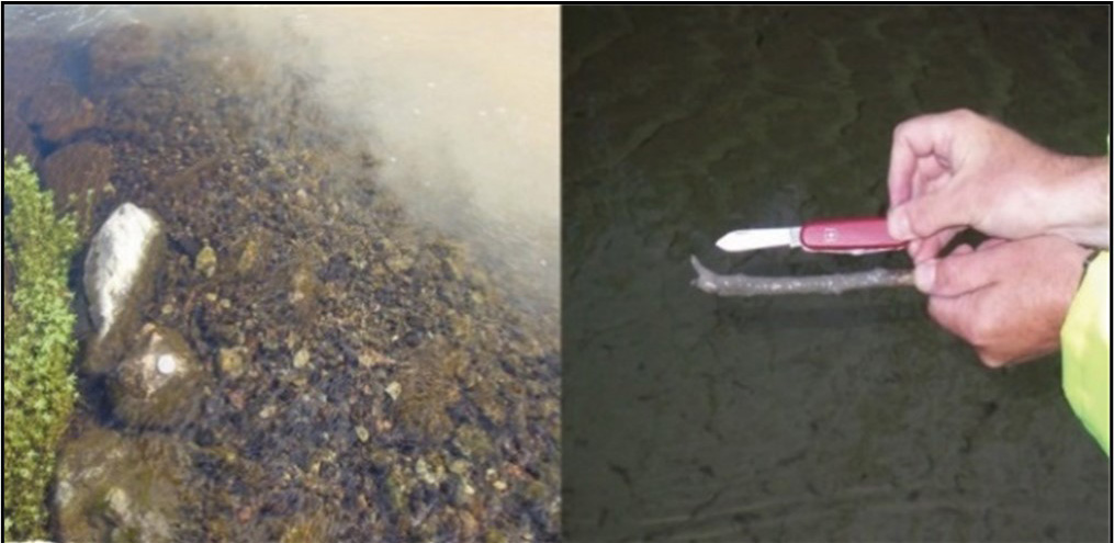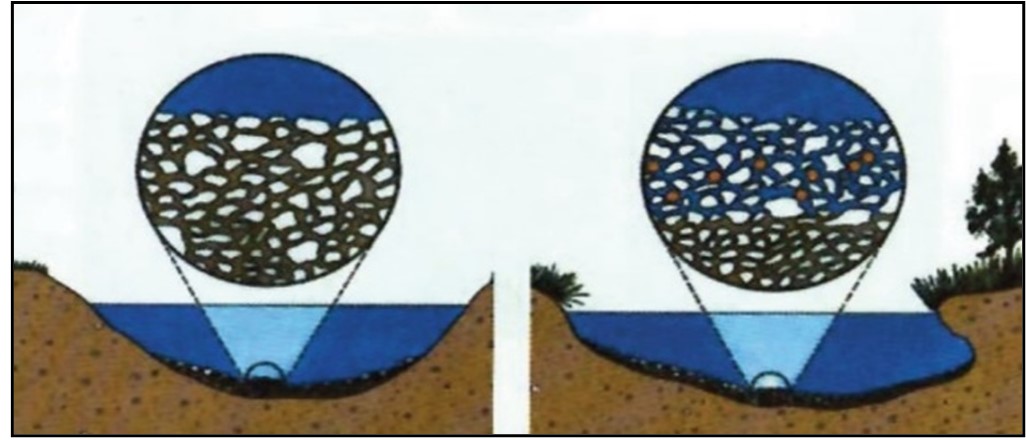 La clarté de l’eau est importante pour diverses raisons. Les sédiments en suspension réduisent la visibilité, ce qui rend difficile la localisation et la capture des proies par les poissons. Les sédiments en suspension (figure 1.2) peuvent aussi endommager les branchies des poissons, entraînant des blessures, de la mortalité et une plus grande vulnérabilité aux maladies et à la prédation. Les sédiments décantés peuvent remplir les fosses et les bancs, ce qui réduit la disponibilité et la qualité de l’habitat de fraie et d’élevage du poisson (figure 1.3). Le remplissage qui se produit pendant les périodes de fraie, d’incubation ou d’éclosion peut étouffer les œufs et les alevins. Les dépôts de sédiments peuvent également réduire l’approvisionnement alimentaire en déplaçant les larves d’insectes qui résident au fond du cours d’eau.