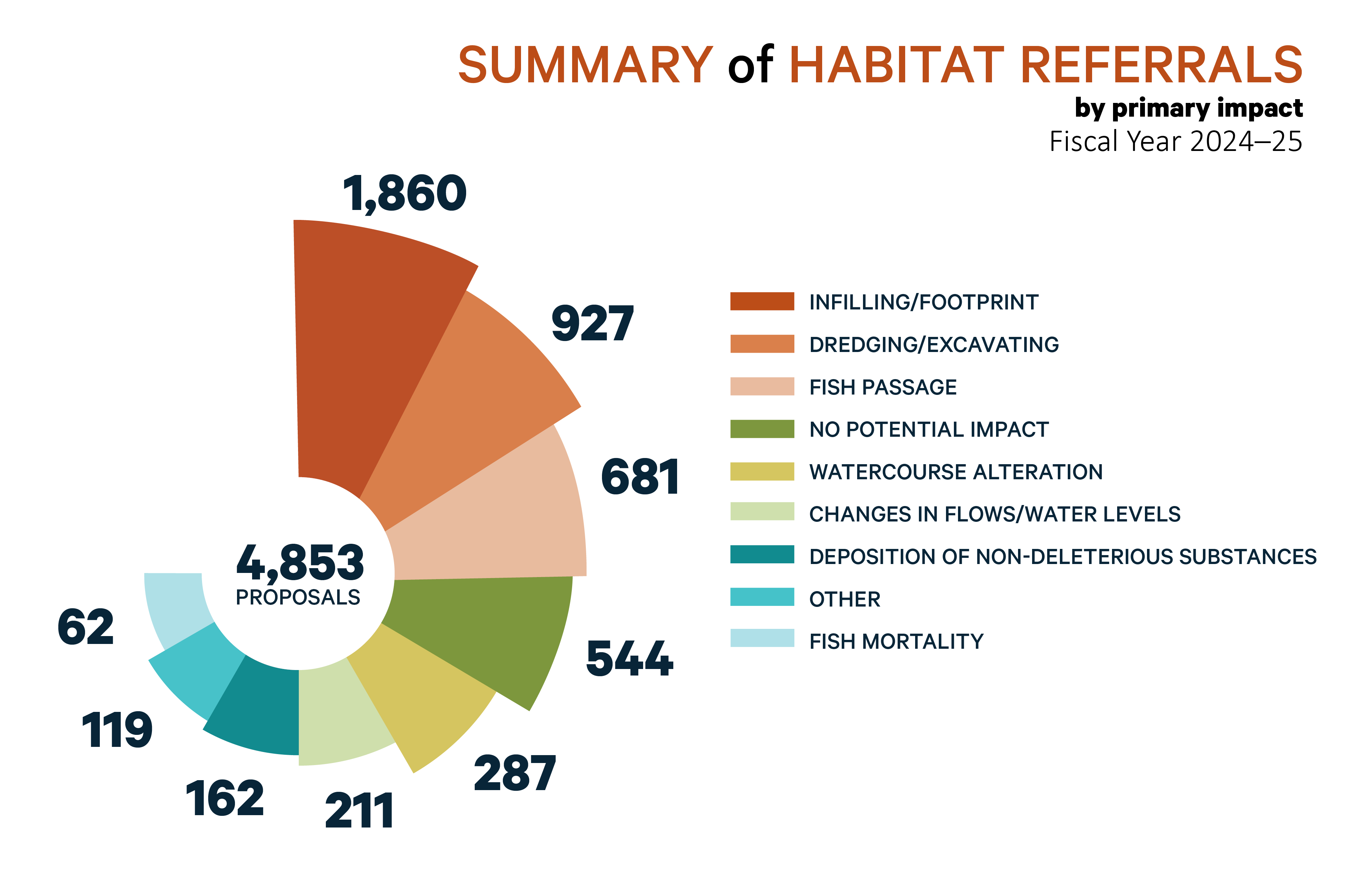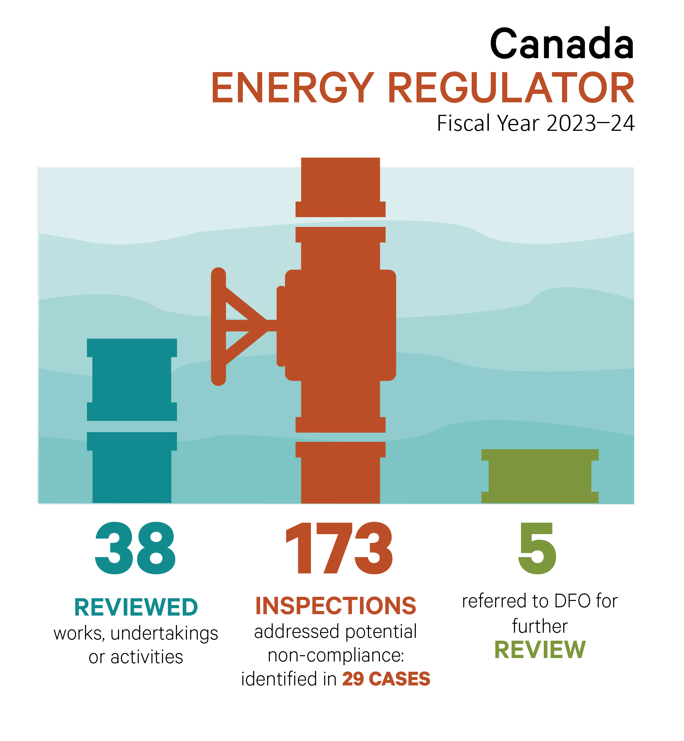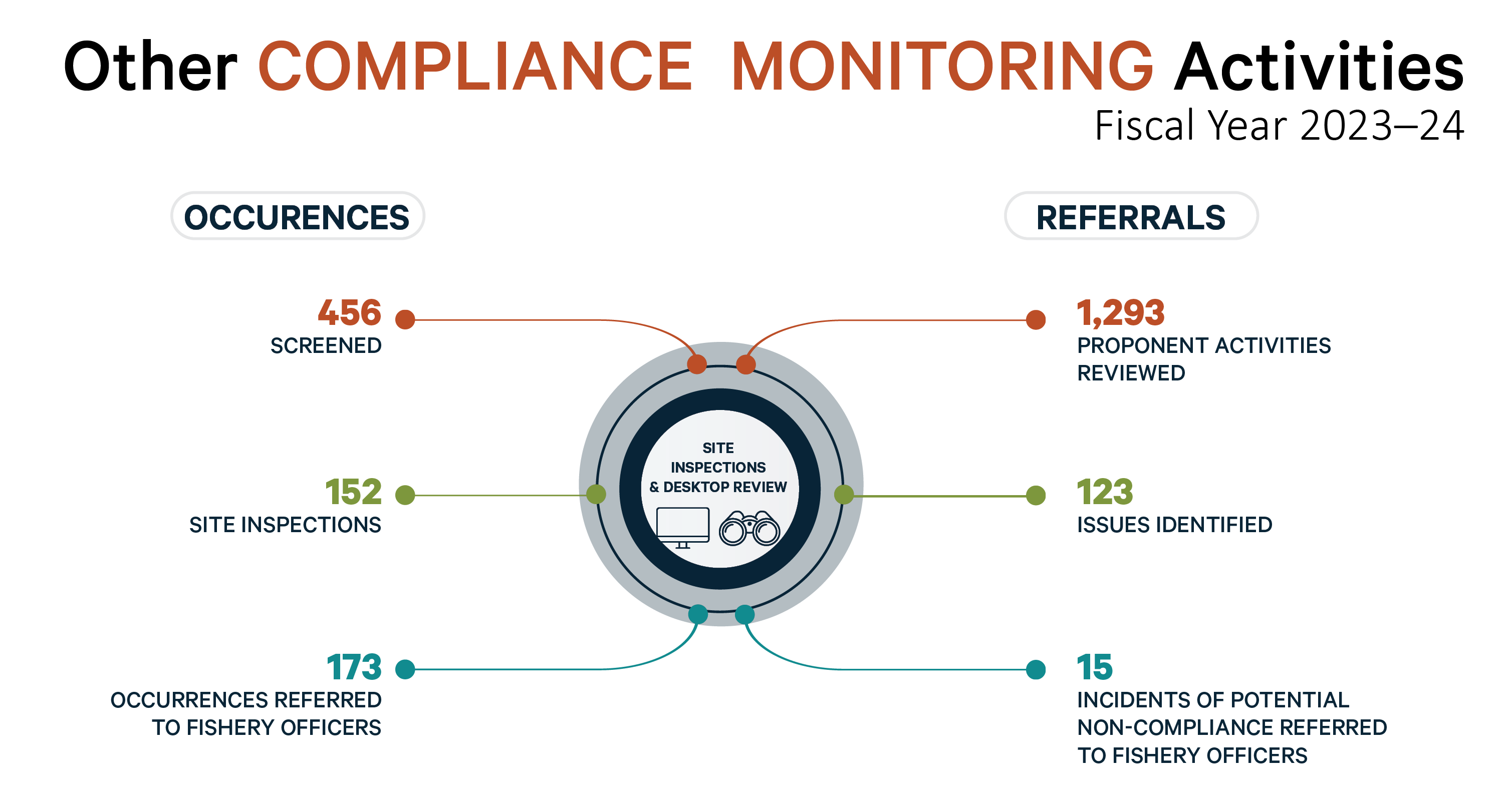 As in previous annual reports, we continue to highlight specific success stories and key results to showcase the different ways that we conserve and protect fish and fish habitat and prevent pollution from entering waters frequented by fish. This includes communicating key statistical information using infographics. We are introducing a few new features this year to include statistics on the compliance monitoring activities of our fishery guardians and the response of our environmental enforcement officers to incidents of unauthorized deposits from unregulated industries subject to the Fisheries Act. This year’s report will also showcase how monetary penalties for environmental violations are used to support projects that will benefit Canada’s natural environment via the Environmental Damages Fund.