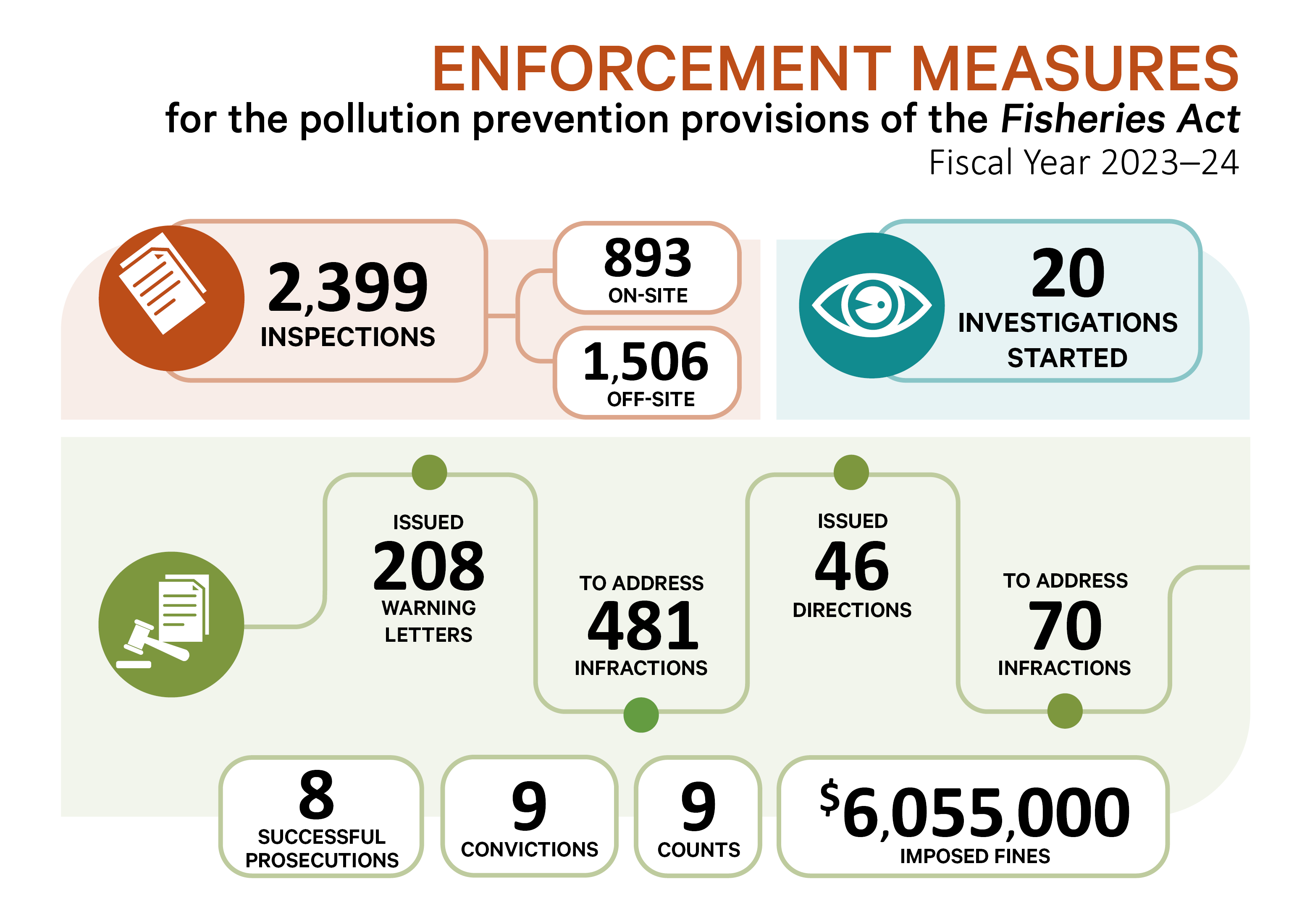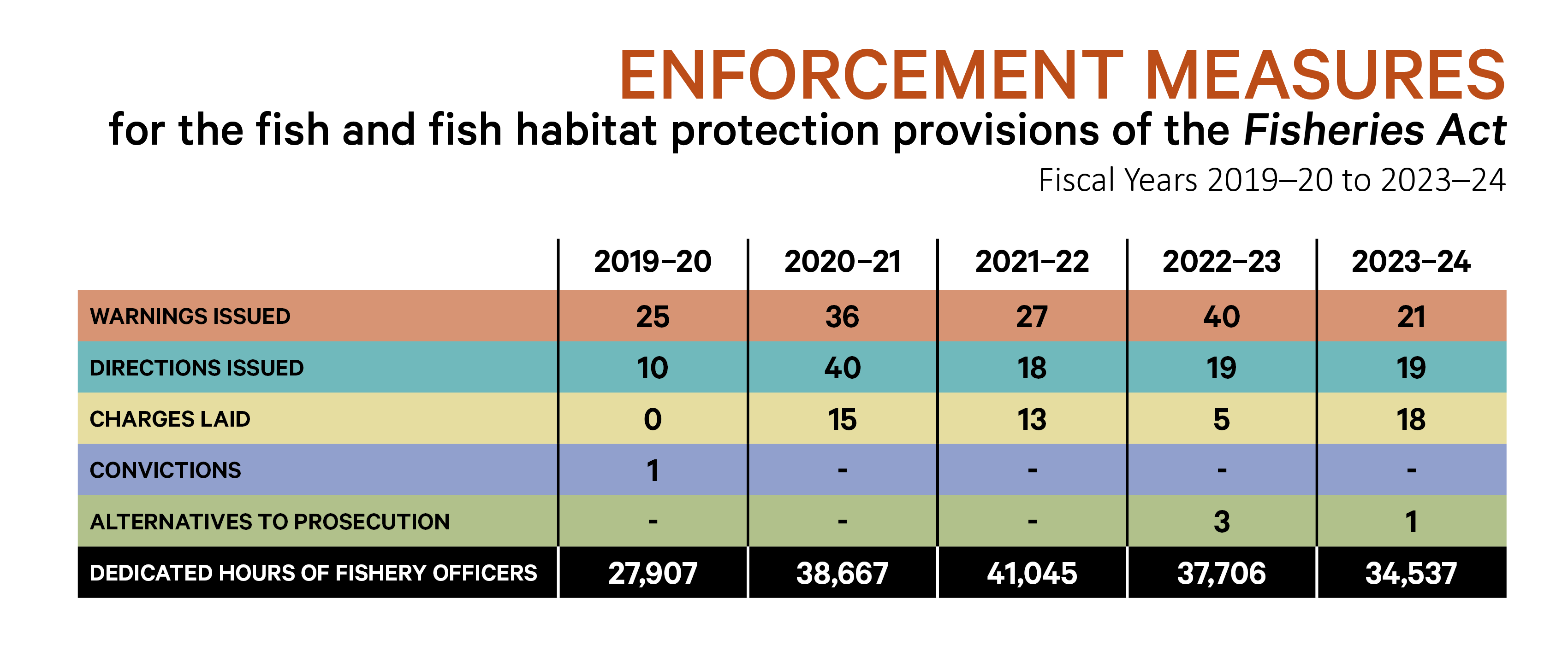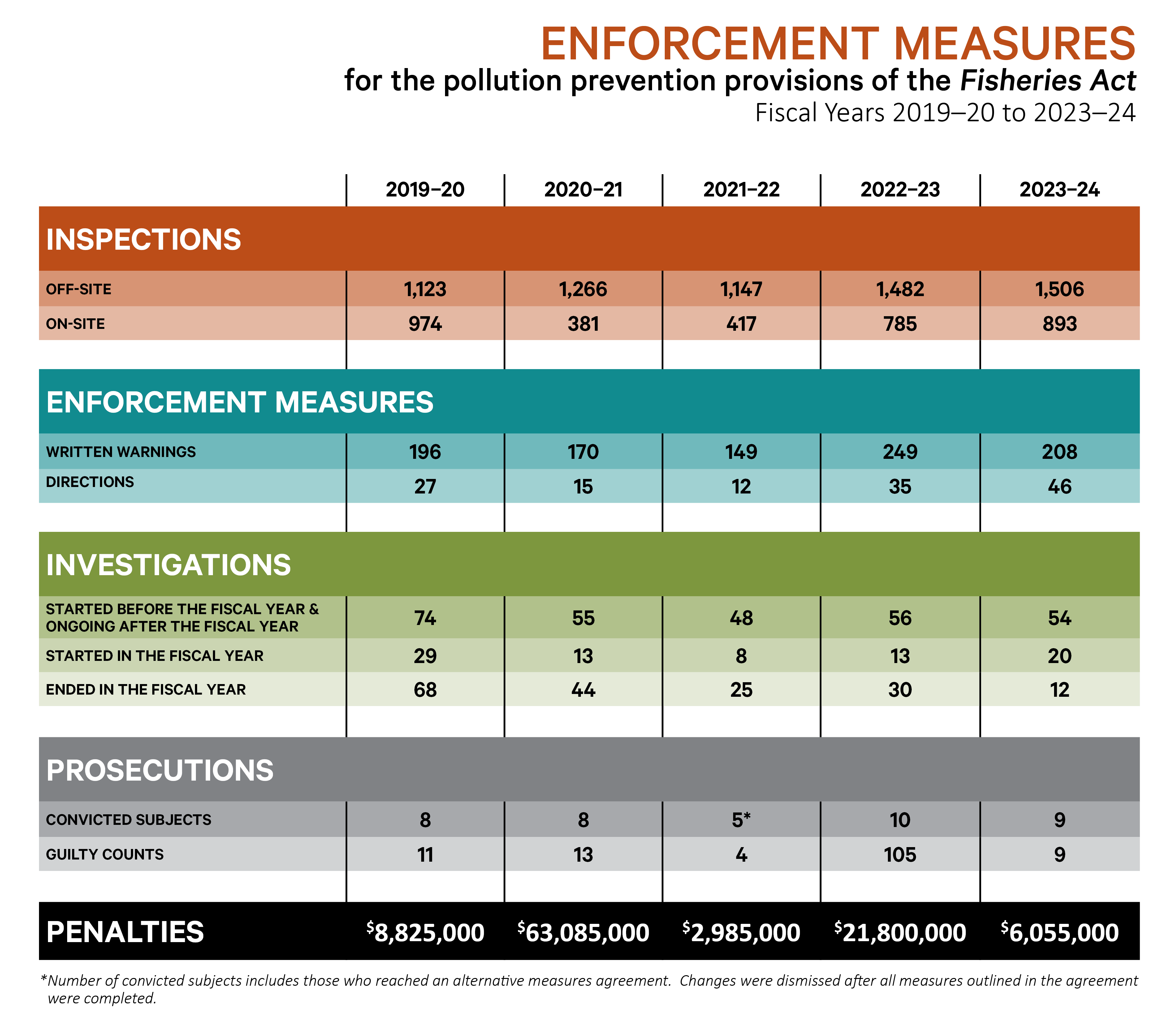 Infographic: Enforcement measures for the pollution prevention provisions of the Fisheries Act - fiscal years 2019-20 to 2023-24