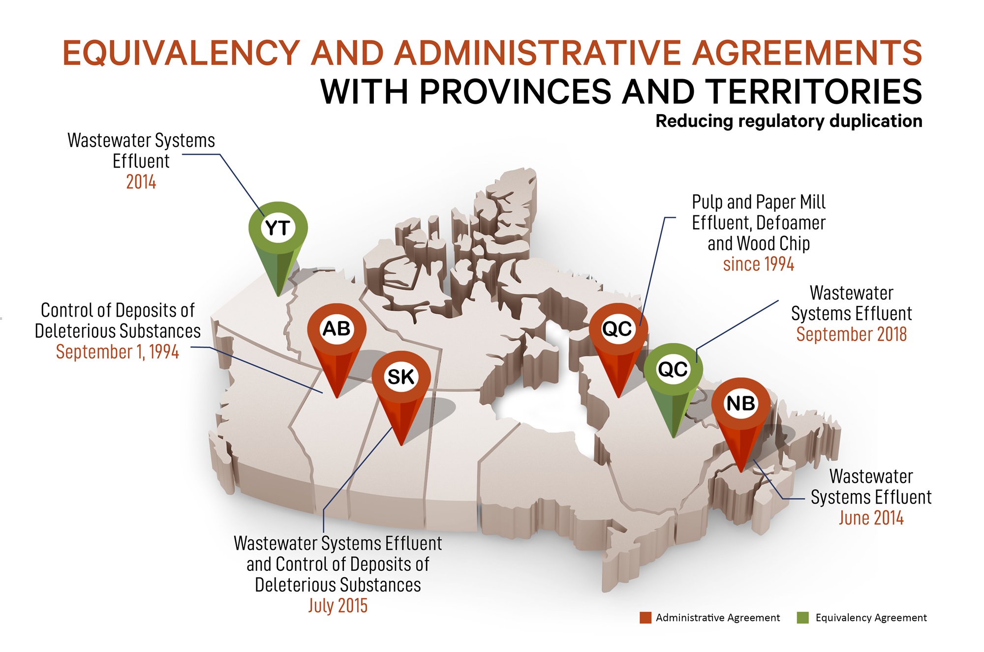 We collaborate closely with provincial and territorial governments, to reduce regulatory duplication and streamline administration related to Fisheries Act provisions. This includes the jurisdictions with which we have entered into pollution prevention-related equivalency agreements and/or arrangements. The Canadian Council of Fisheries and Aquaculture Ministers and the Canadian Council of Ministers of the Environment are key venues used to advance these partnerships.