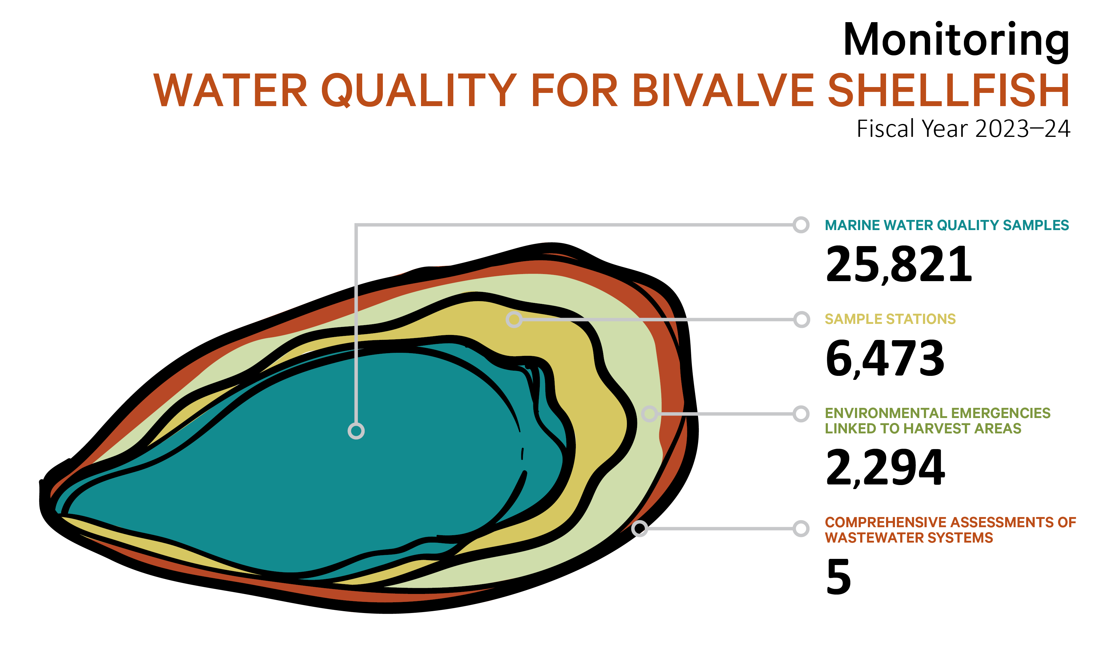25,821 Marine Water Quality Samples, 6,473 Sample Stations, 2,294 Environmental Emergencies Linked to Harvest Areas, 5 Comprehensive Assessments of Wastewater Systems