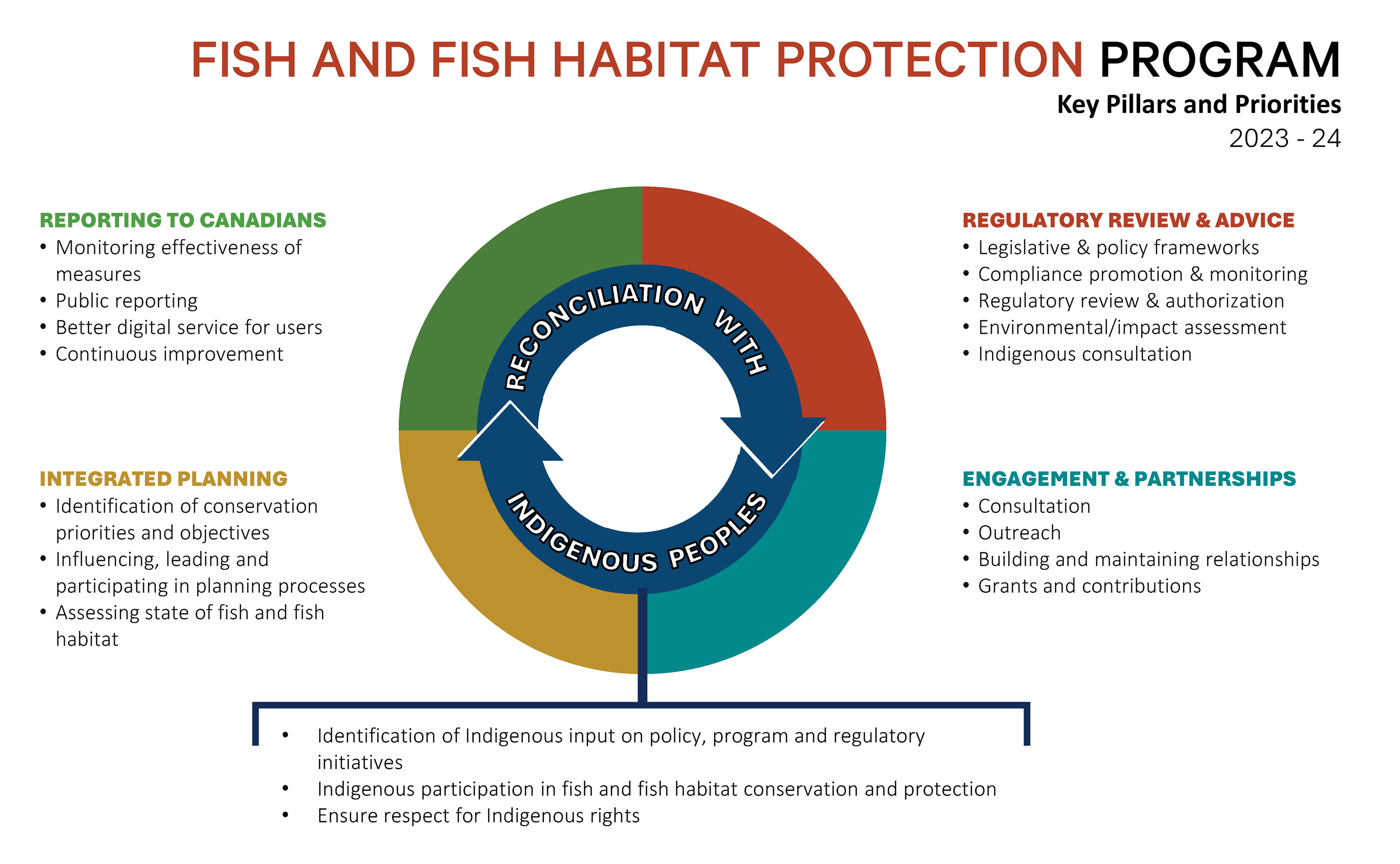 Fisheries and Oceans Canada and Environment and Climate Change Canada are committed to protecting Canada’s aquatic environment in ways that benefit fish for future generations. We actively work together to achieve an integrated approach to the conservation and protection of fish and fish habitat across Canada to empower Canadians to be informed and effective in managing threats and impacts to aquatic ecosystems caused by human activities. Our efforts include the support and collaboration of Indigenous Peoples, stakeholders, and other levels of government.