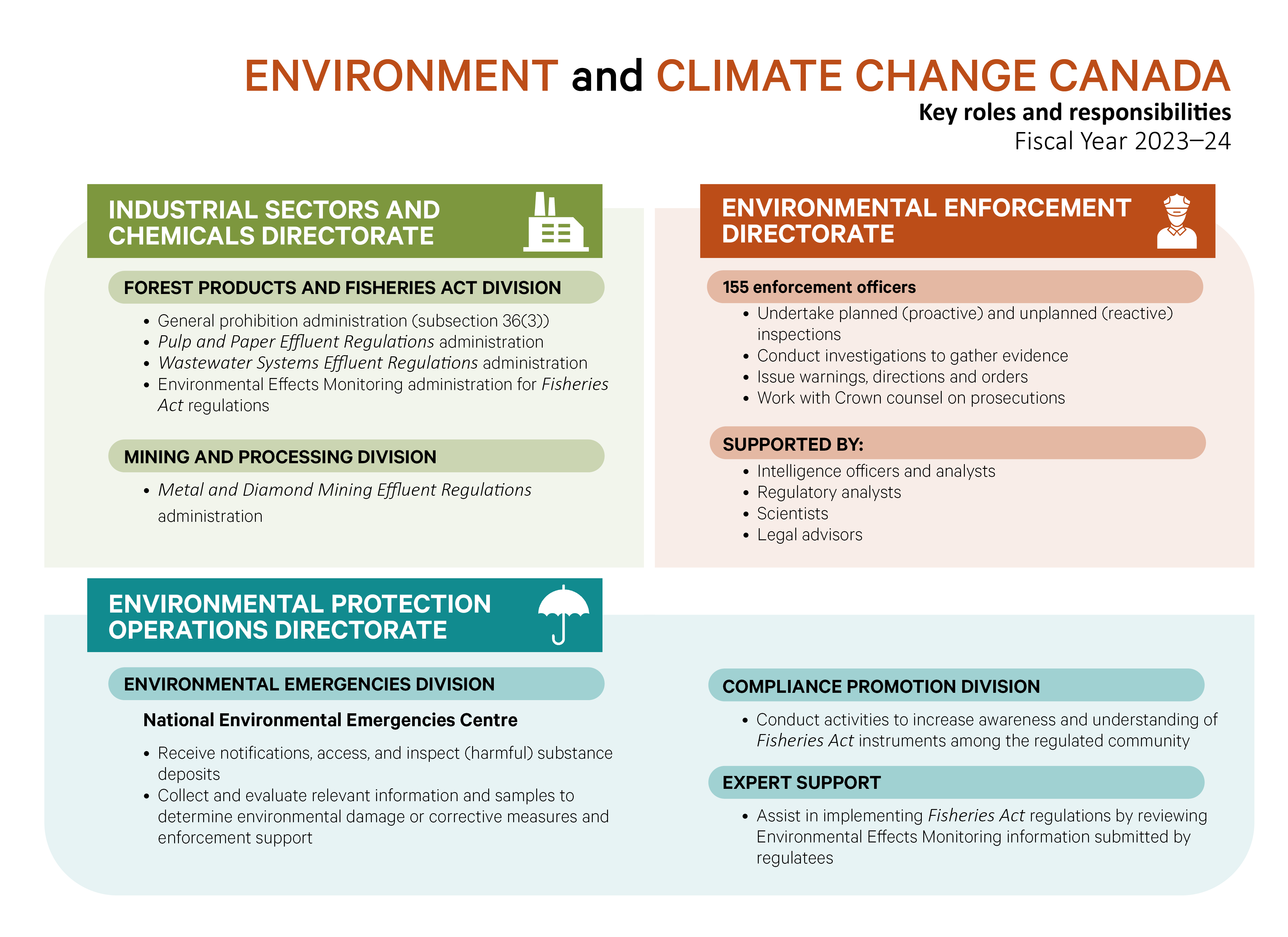 Fisheries and Oceans Canada (DFO) and Environment and Climate Change Canada (ECCC) work together throughout the year to prevent pollution from entering water and harming fish and their habitat. This includes working in collaboration to review cross-cutting regulations enabled through the Fisheries Act and to jointly administer programs with other departments and agencies.