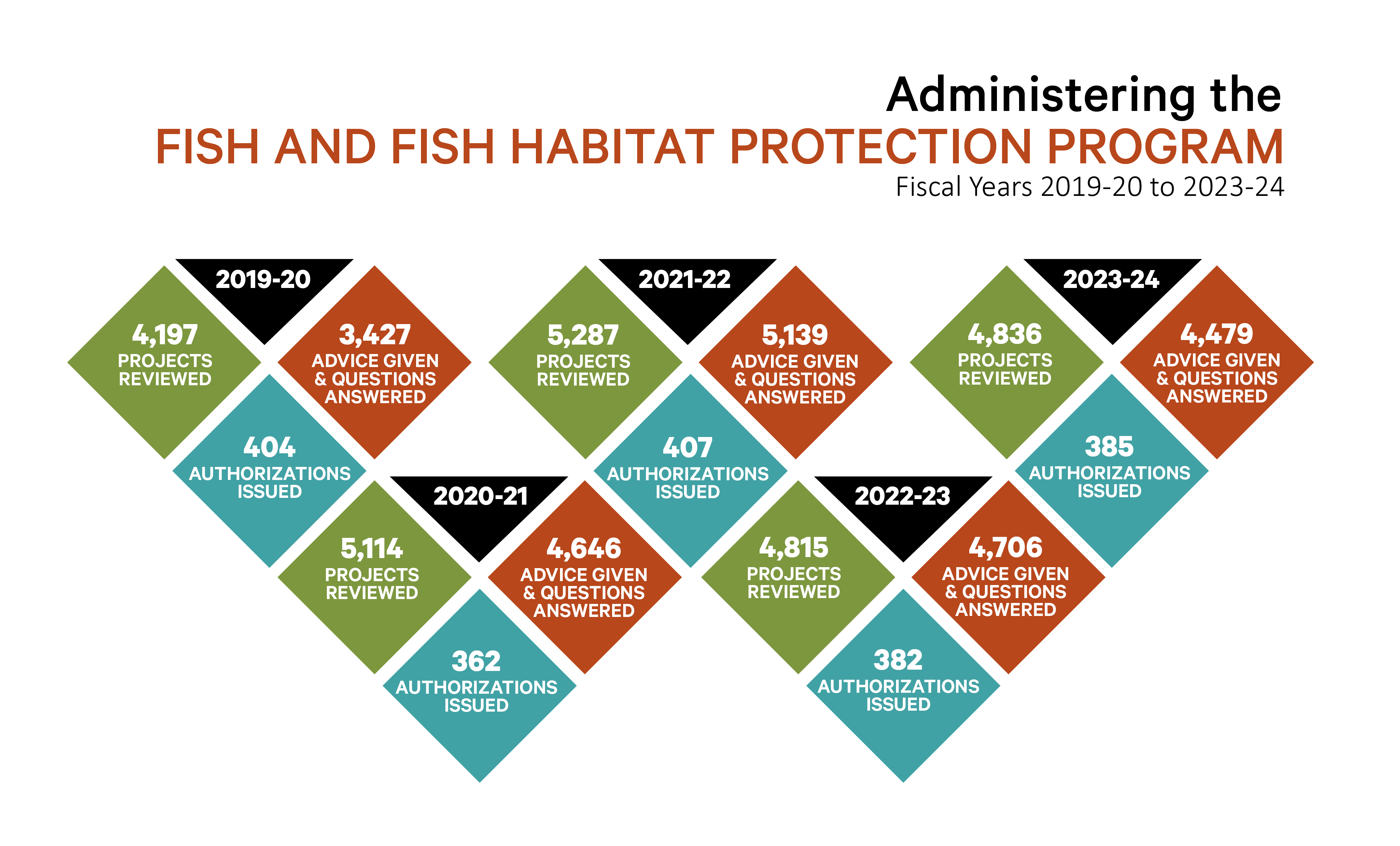 Detailed information about the relevant provisions of the Fisheries Act, and the way our departments are organized to administer the fish and fish habitat protection and the pollution prevention provisions, are in the annex of this report. The annex also features tables with statistics on our activities to conserve and protect fish and fish habitat and to prevent pollution during the 2023-24 reporting year, as well as year-over-year comparative statistics to enable analysis and increased understanding about our work.