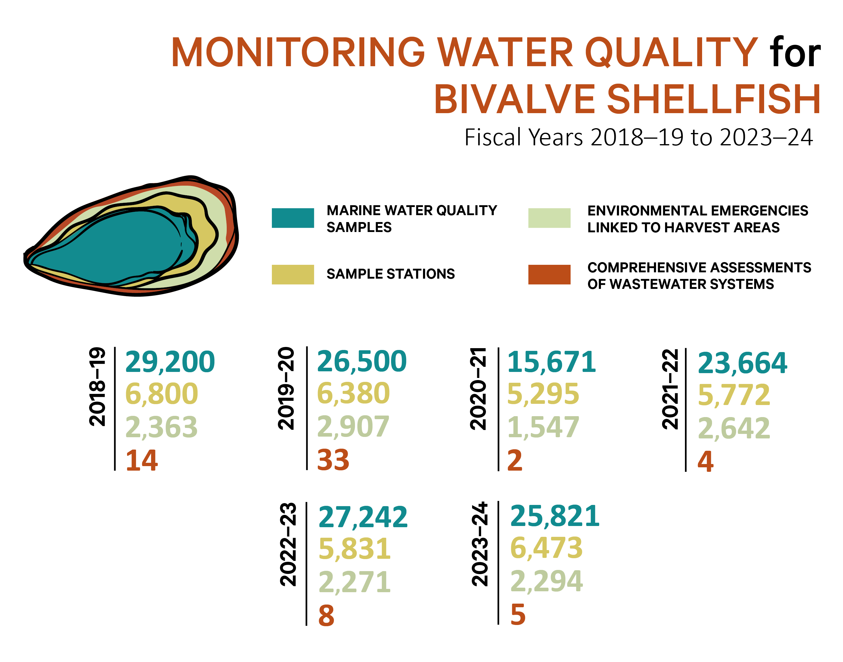 Infographic: Monitoring water quality for bivalve shellfish - fiscal years 2019-20 to 2023-24