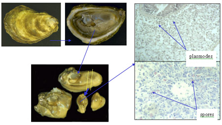 Tissus d’huître mous retirés de la coquille (en bas à gauche); coupes transversales pour examen microscopique : spores dans une glande digestive (en haut à droite) et stade de plasmode dans les branchies (en bas à droite)