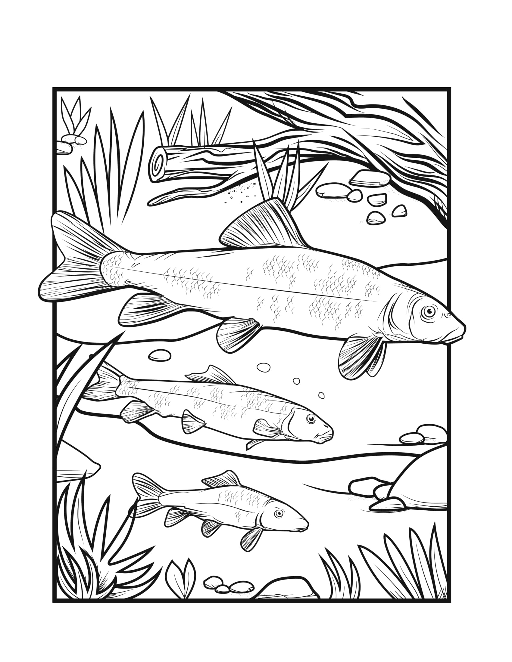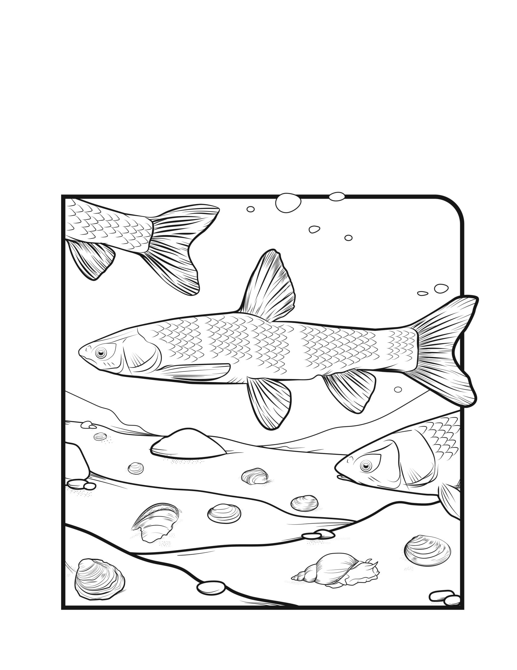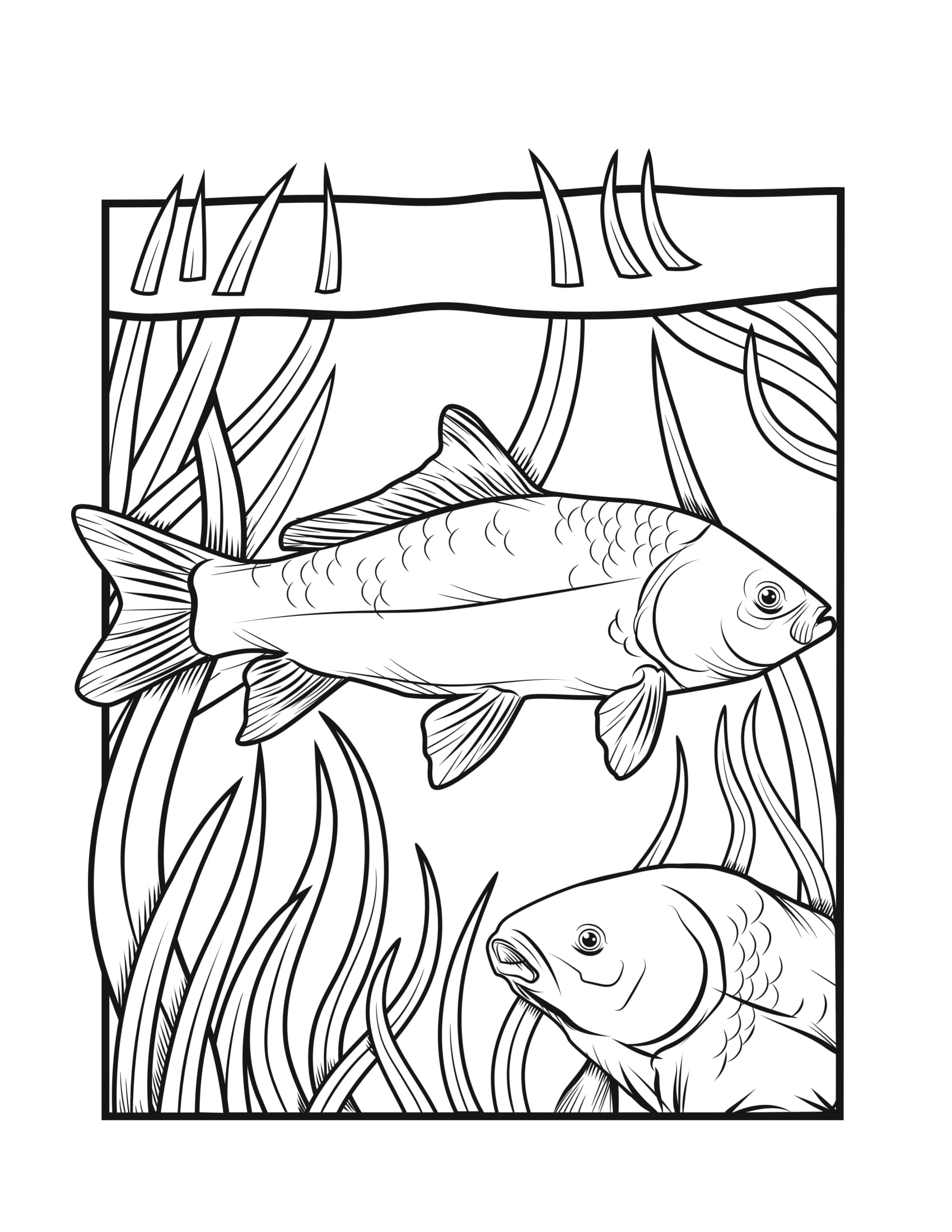 Illustrations of 12 aquatic species at risk featured in the colouring book including Grass Carp, Black Carp, Bighead Carp, Silver Carp, Common Carp, Goldfish, Golden Shiner, Fallfish, White Sucker, Creek Chub, Bigmouth Buffalo, Gizzard Shad, Mooneye.