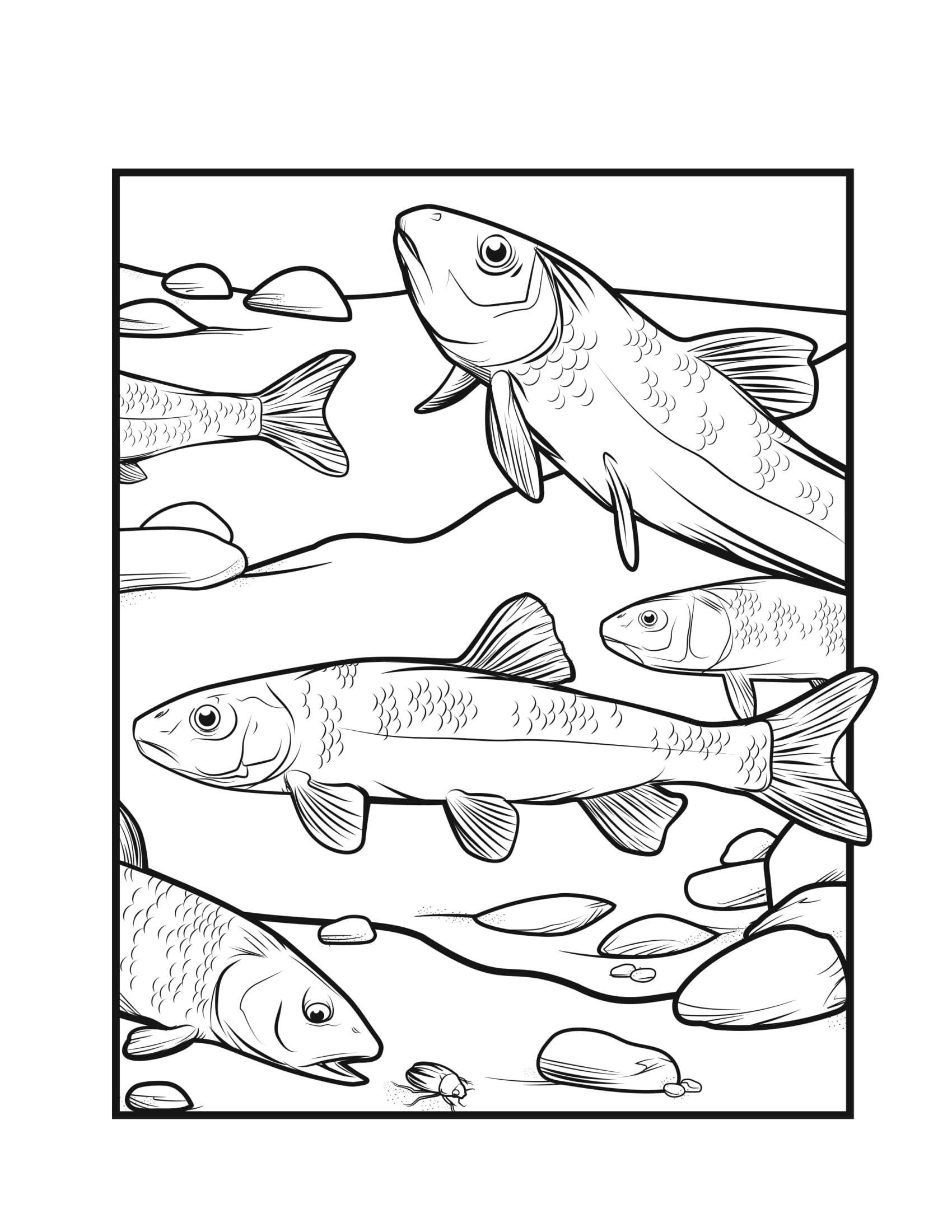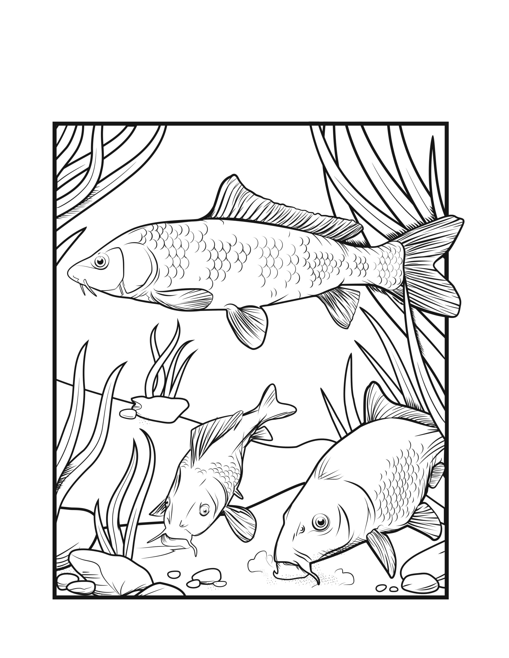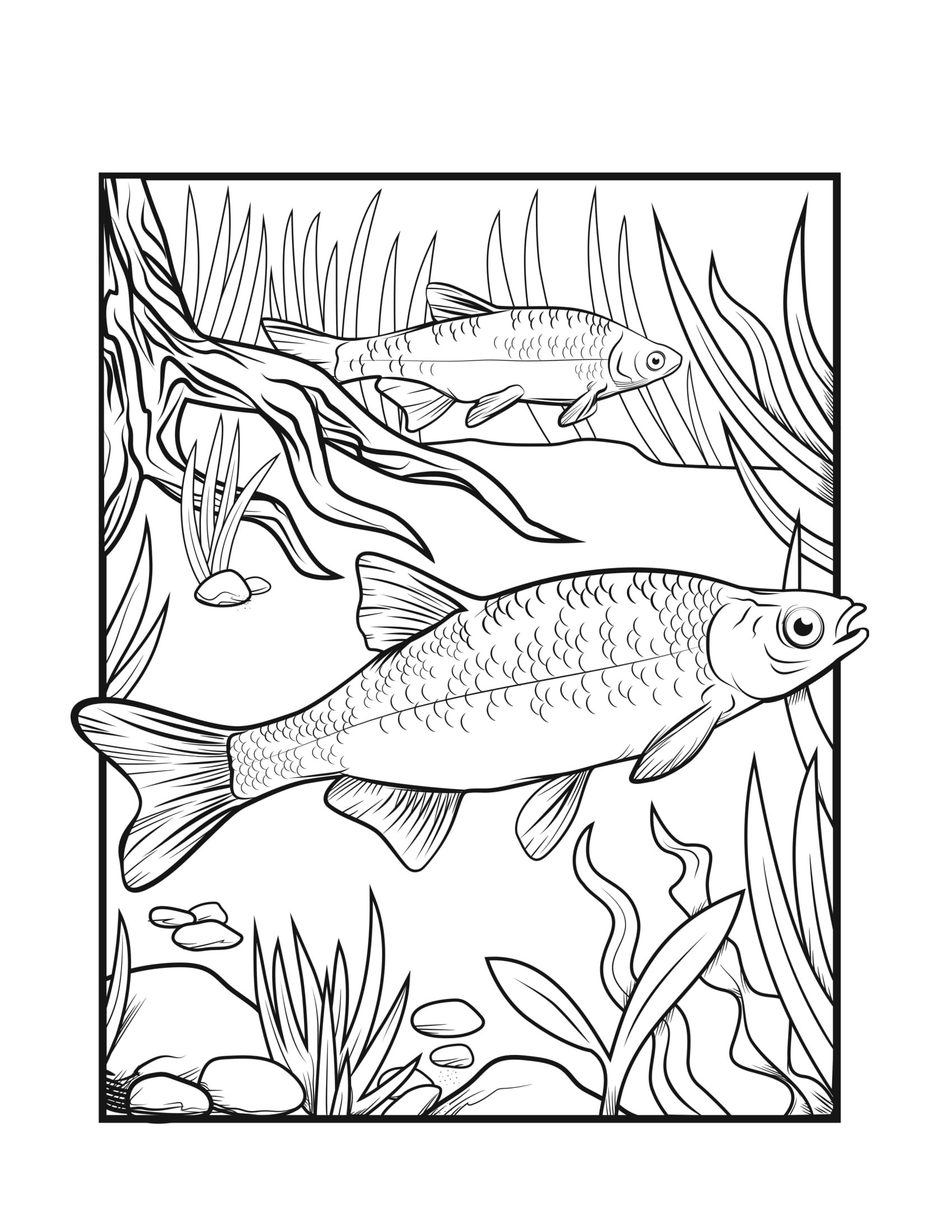 Illustrations of 12 aquatic species at risk featured in the colouring book including Grass Carp, Black Carp, Bighead Carp, Silver Carp, Common Carp, Goldfish, Golden Shiner, Fallfish, White Sucker, Creek Chub, Bigmouth Buffalo, Gizzard Shad, Mooneye.