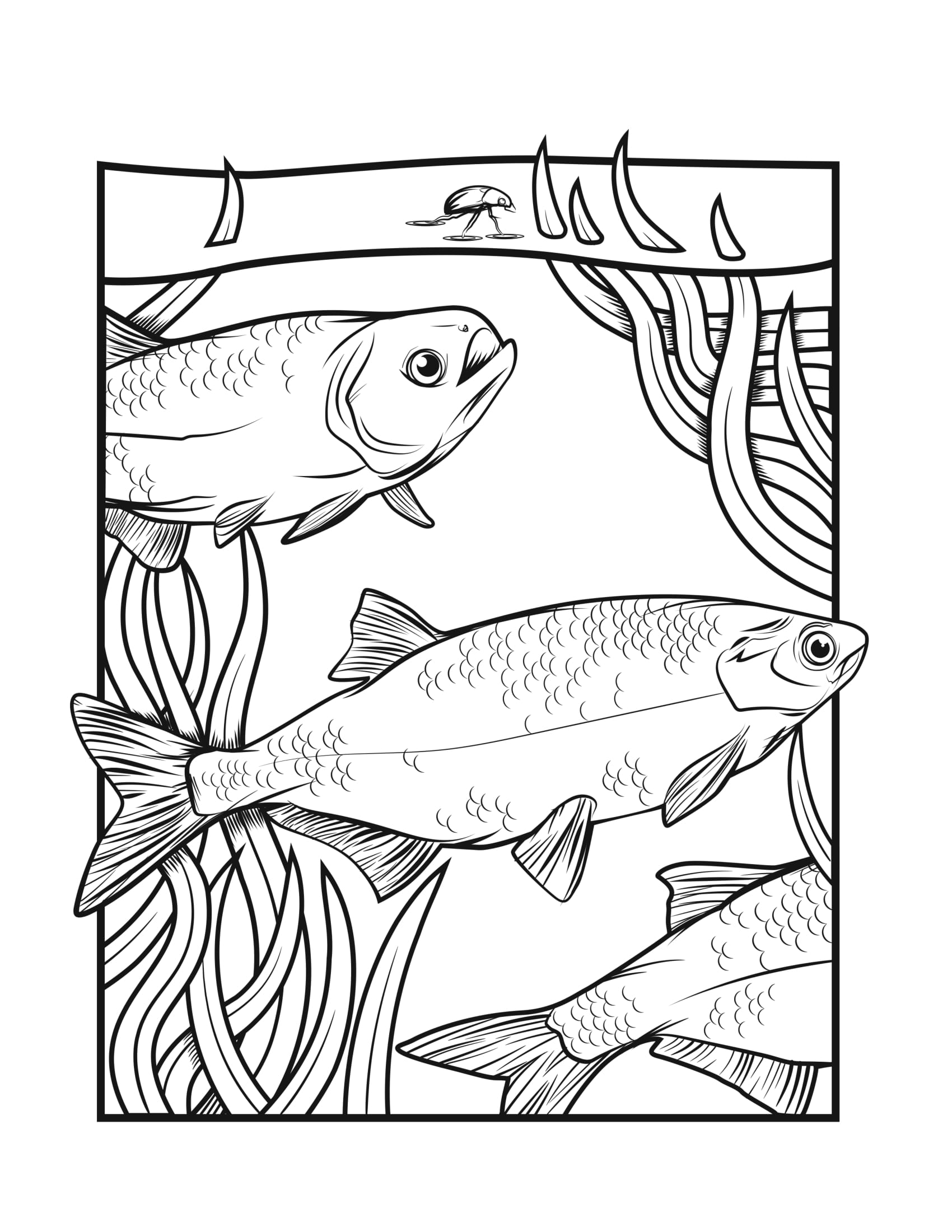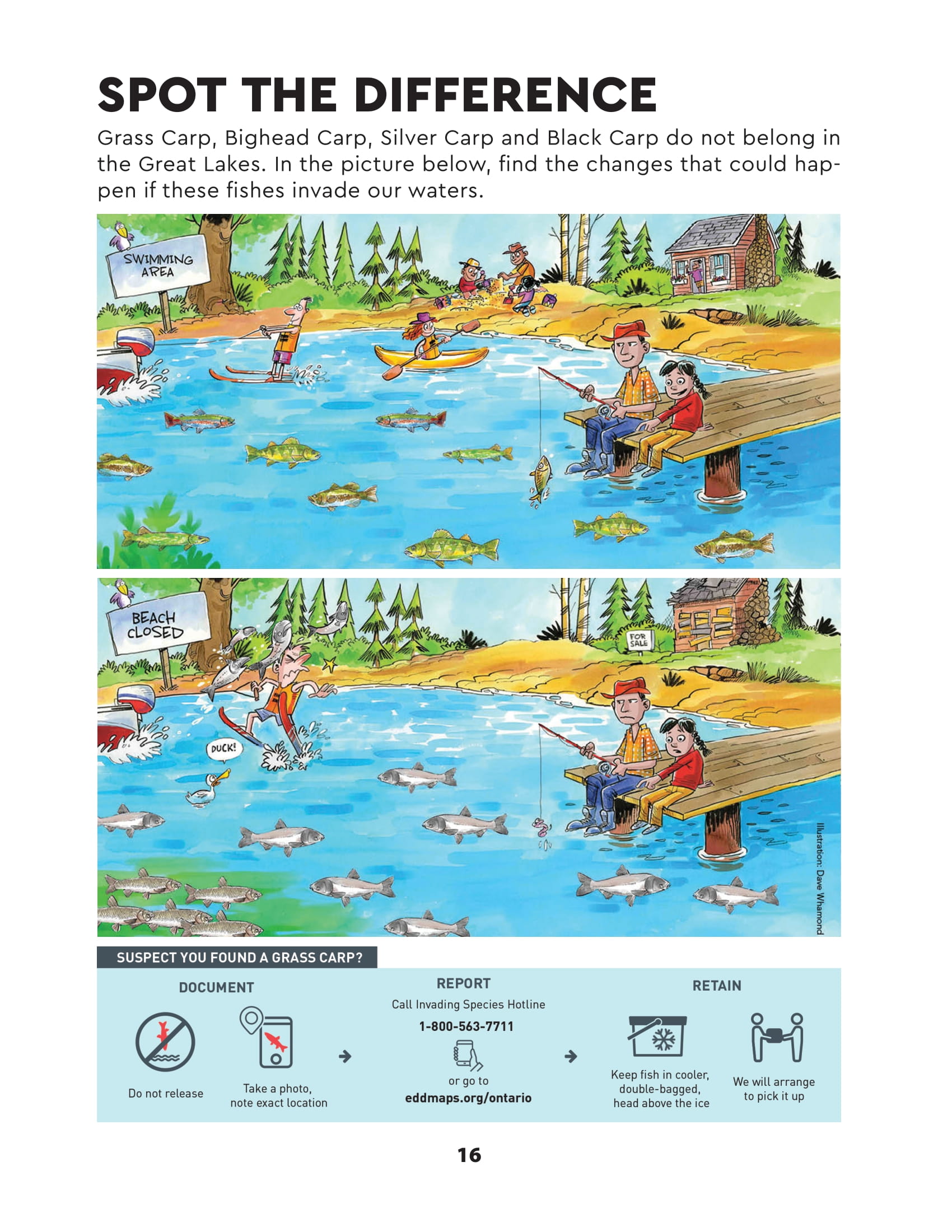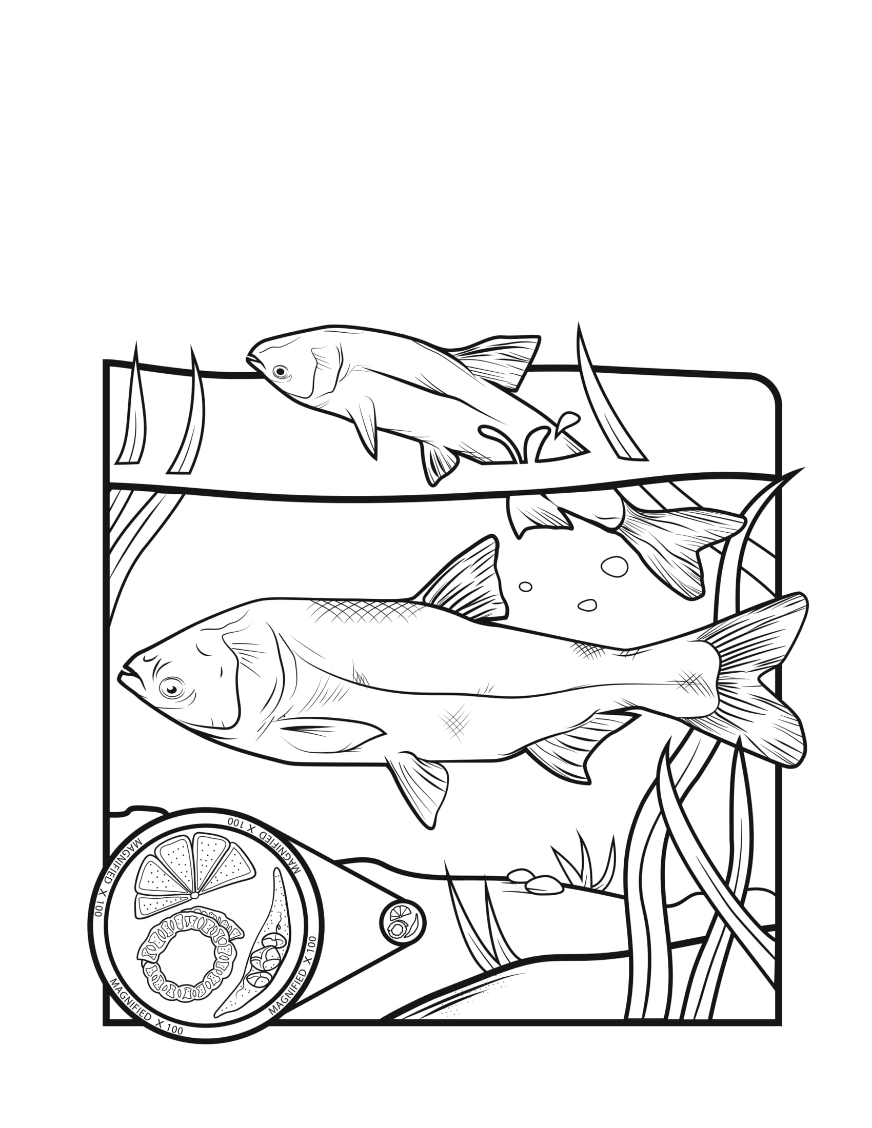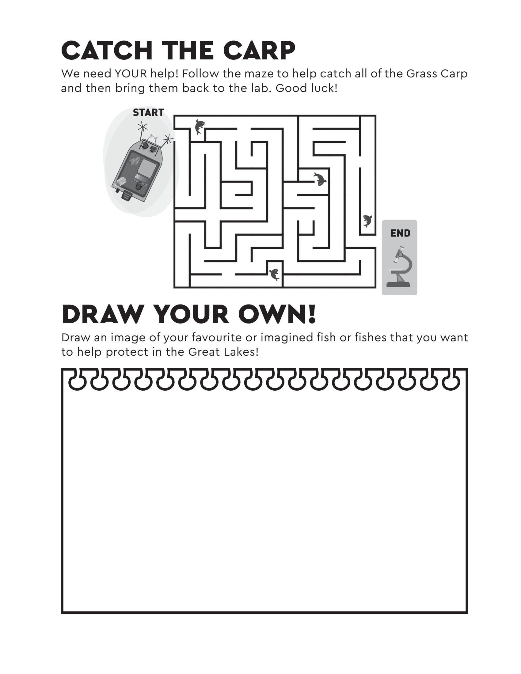 In this colouring book, we highlight 4 invasive fishes that threaten the Great Lakes: Grass Carp, Bighead Carp, Silver Carp and Black Carp, along with other fishes that look somewhat like them. These 4 carps were brought to the United States (U.S.) to control pests on fish farms and were able to escape because of flooding and are now making their way towards the Great Lakes! Of the 4 carps, Grass Carp are the closest to invading the Canadian Great Lakes. If we don't stop them, these fishes could take over the Great Lakes and leave little food or space for native fishes like Walleye, Largemouth Bass and Yellow Perch. We need everyone's help to keep them from getting into Canadian waters.