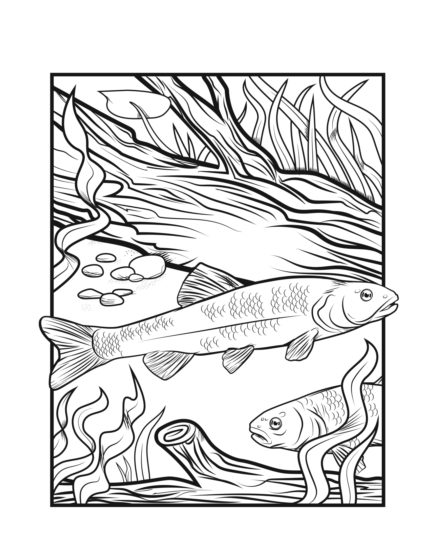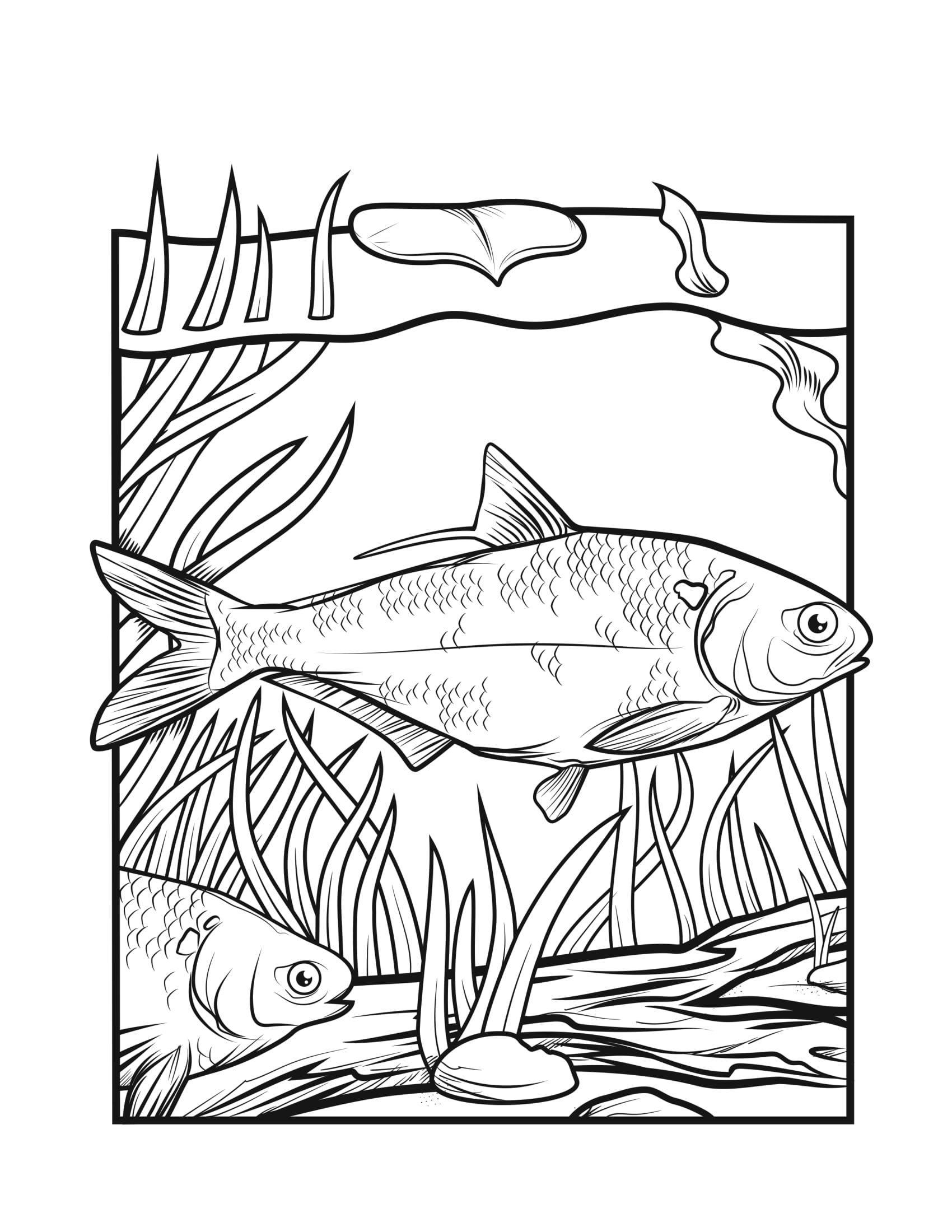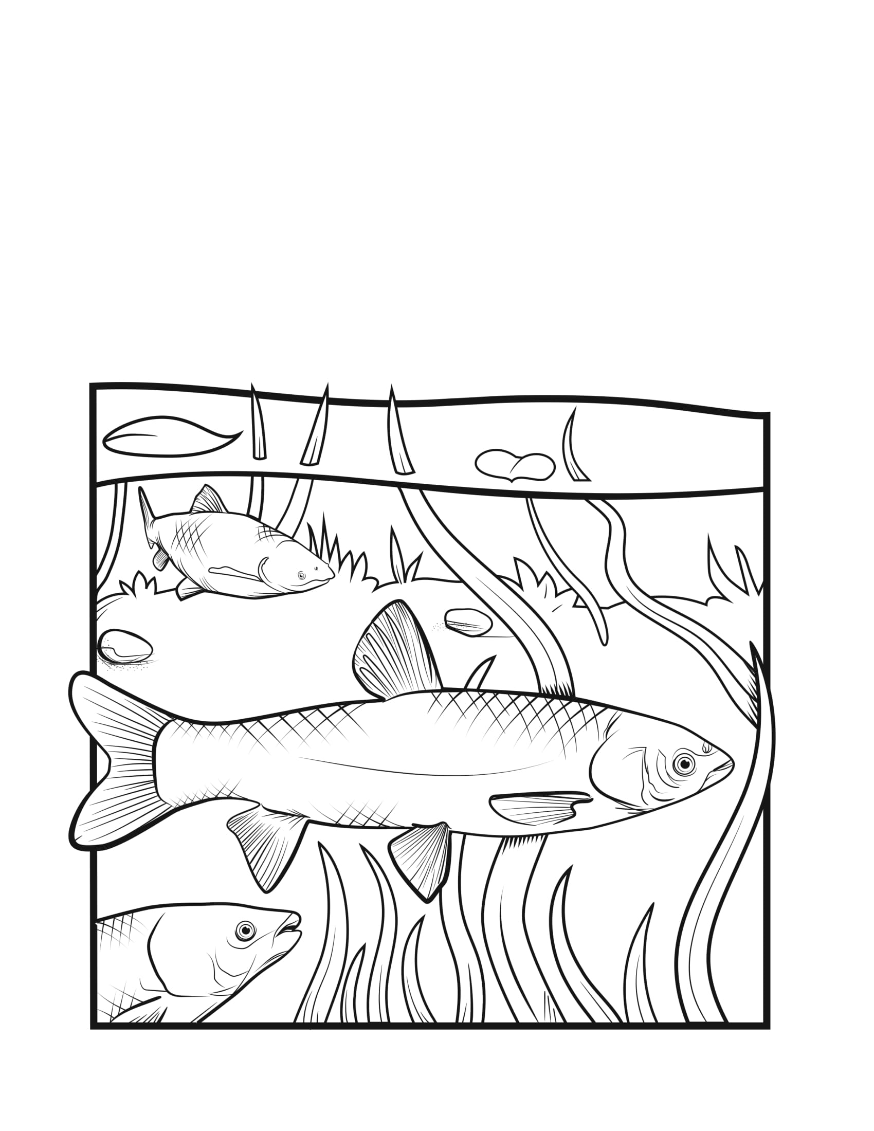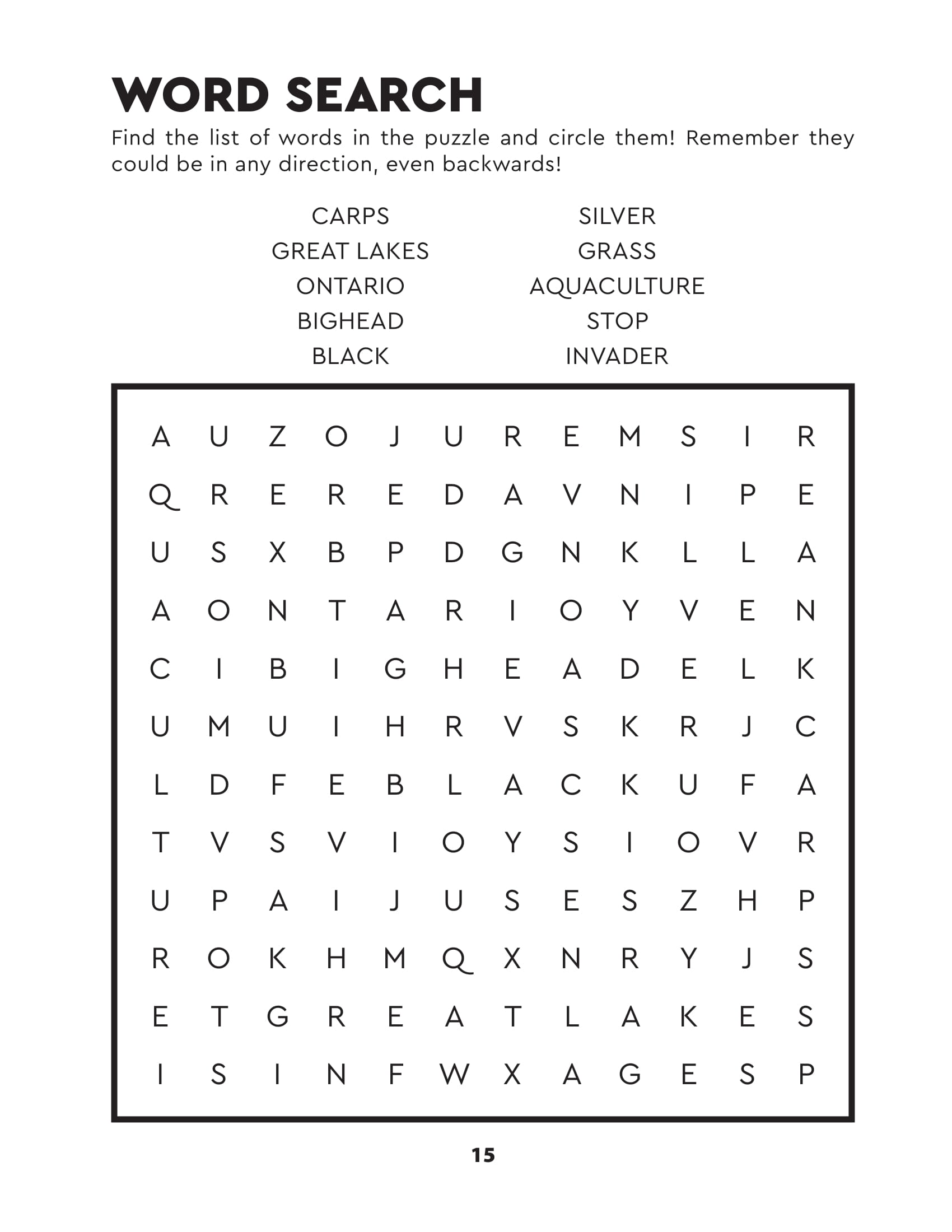 In this colouring book, we highlight 4 invasive fishes that threaten the Great Lakes: Grass Carp, Bighead Carp, Silver Carp and Black Carp, along with other fishes that look somewhat like them. These 4 carps were brought to the United States (U.S.) to control pests on fish farms and were able to escape because of flooding and are now making their way towards the Great Lakes! Of the 4 carps, Grass Carp are the closest to invading the Canadian Great Lakes. If we don't stop them, these fishes could take over the Great Lakes and leave little food or space for native fishes like Walleye, Largemouth Bass and Yellow Perch. We need everyone's help to keep them from getting into Canadian waters.