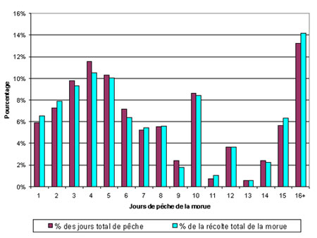 Graphique 5. Distribution de l’effort total des pêcheurs adultes et des prises totales de morue selon le nombre de jours de pêche de la morue.
